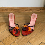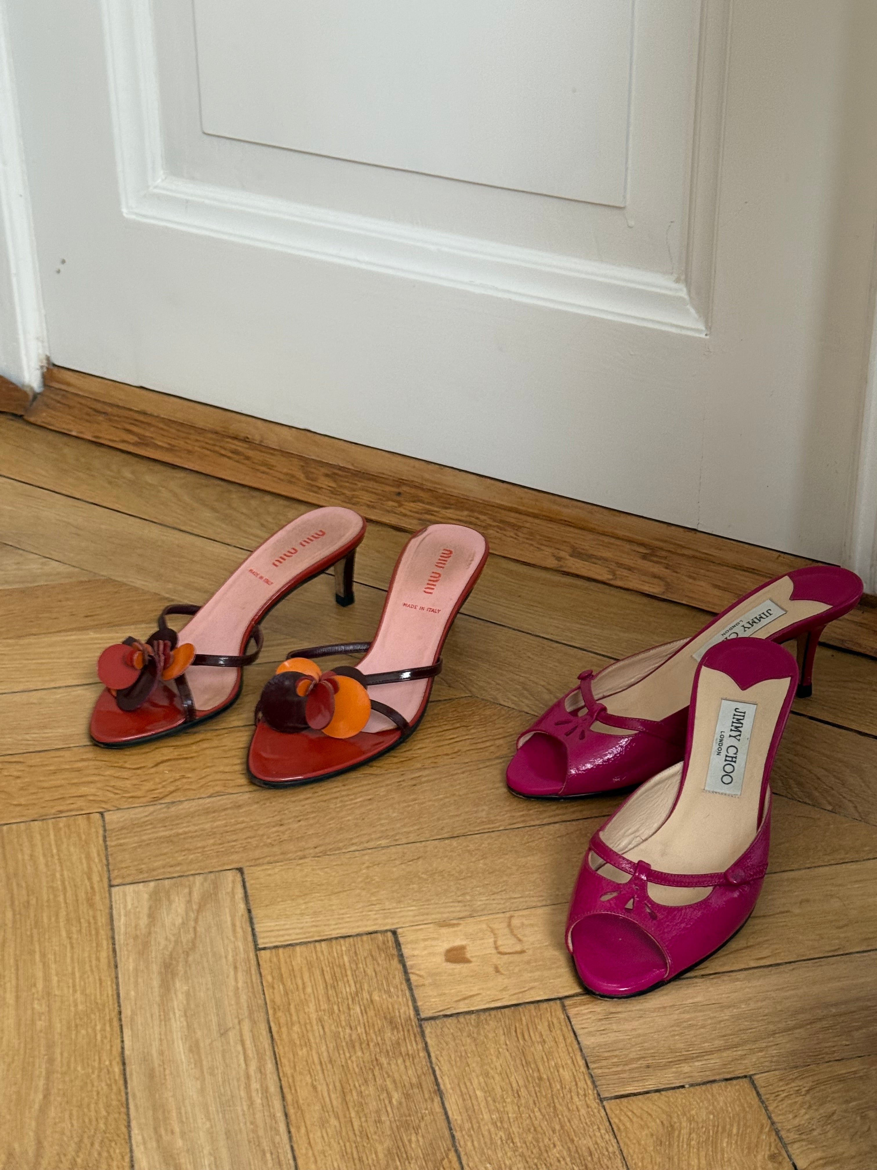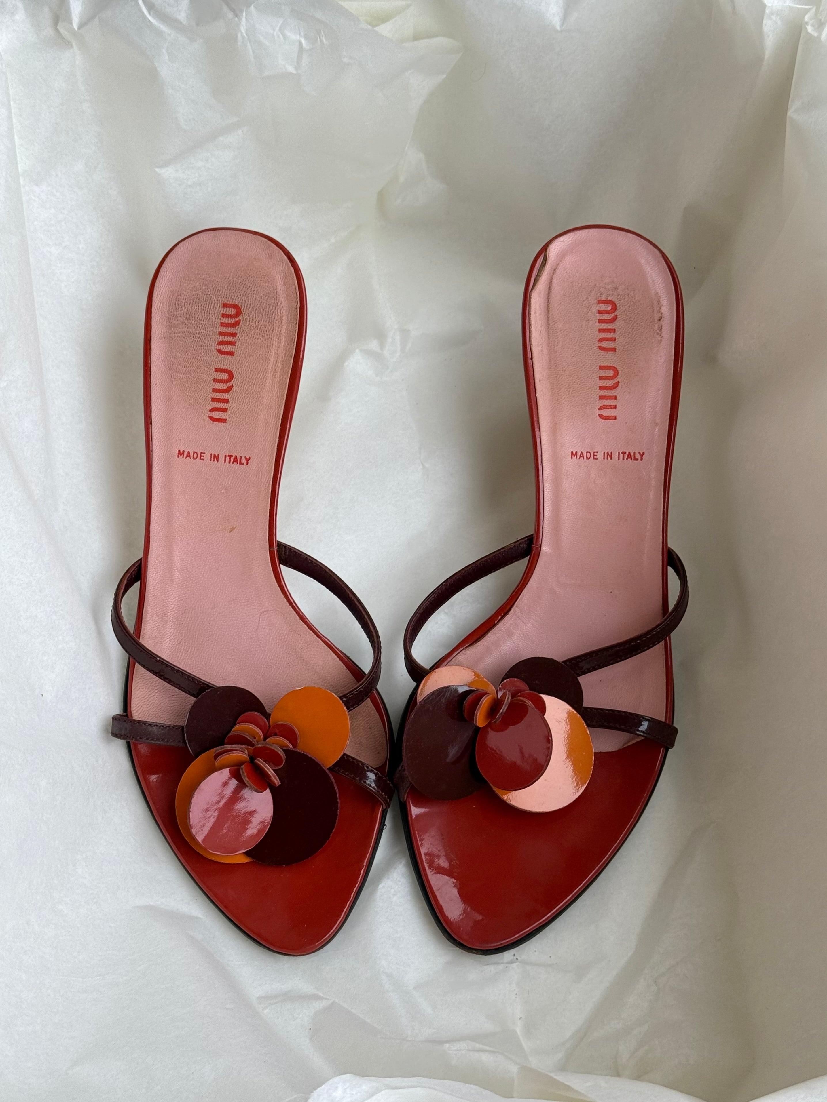 Rare vintage Miu Miu kitten heels featuring playful appliqué details and a pointed toe silhouette.