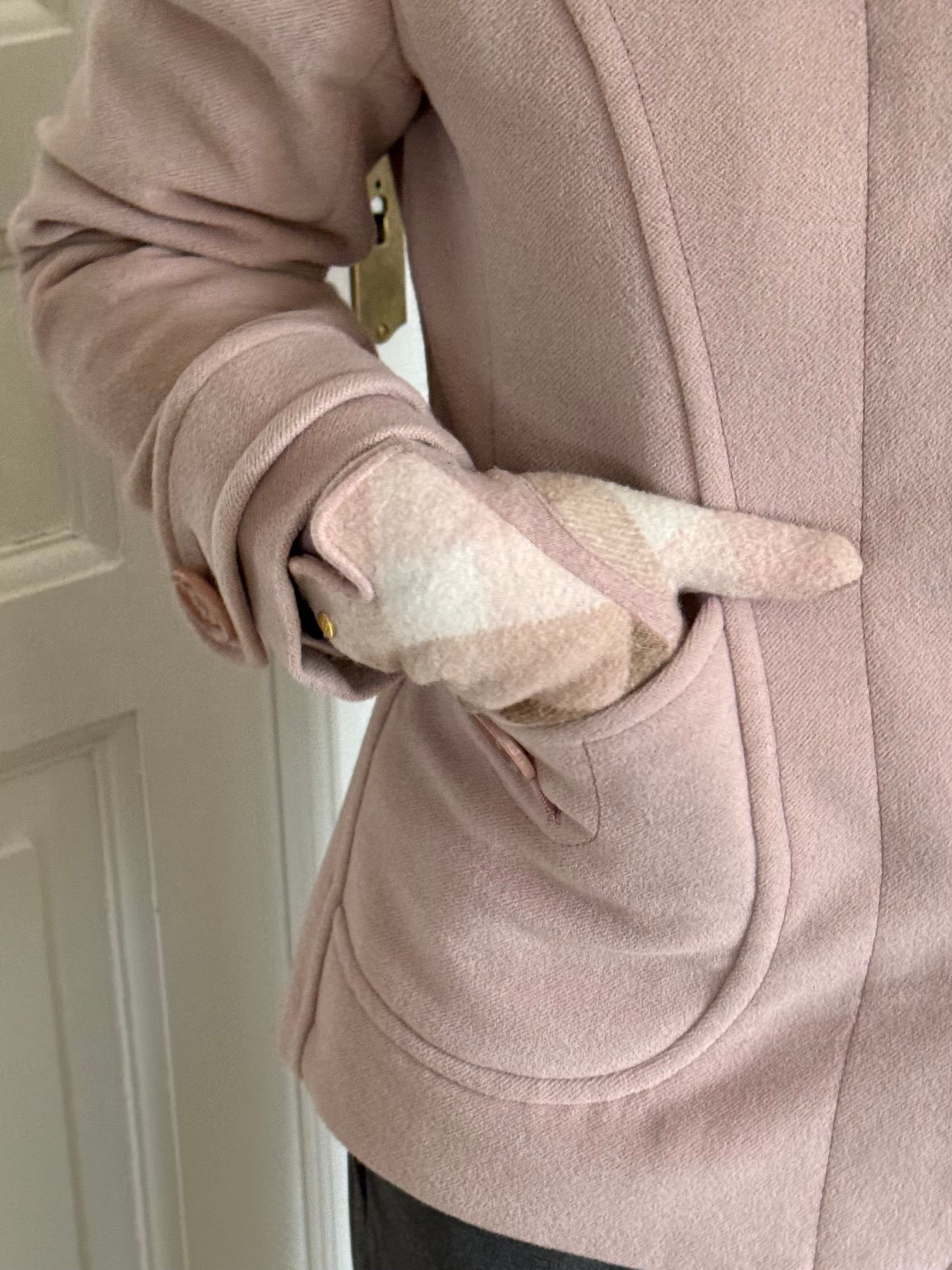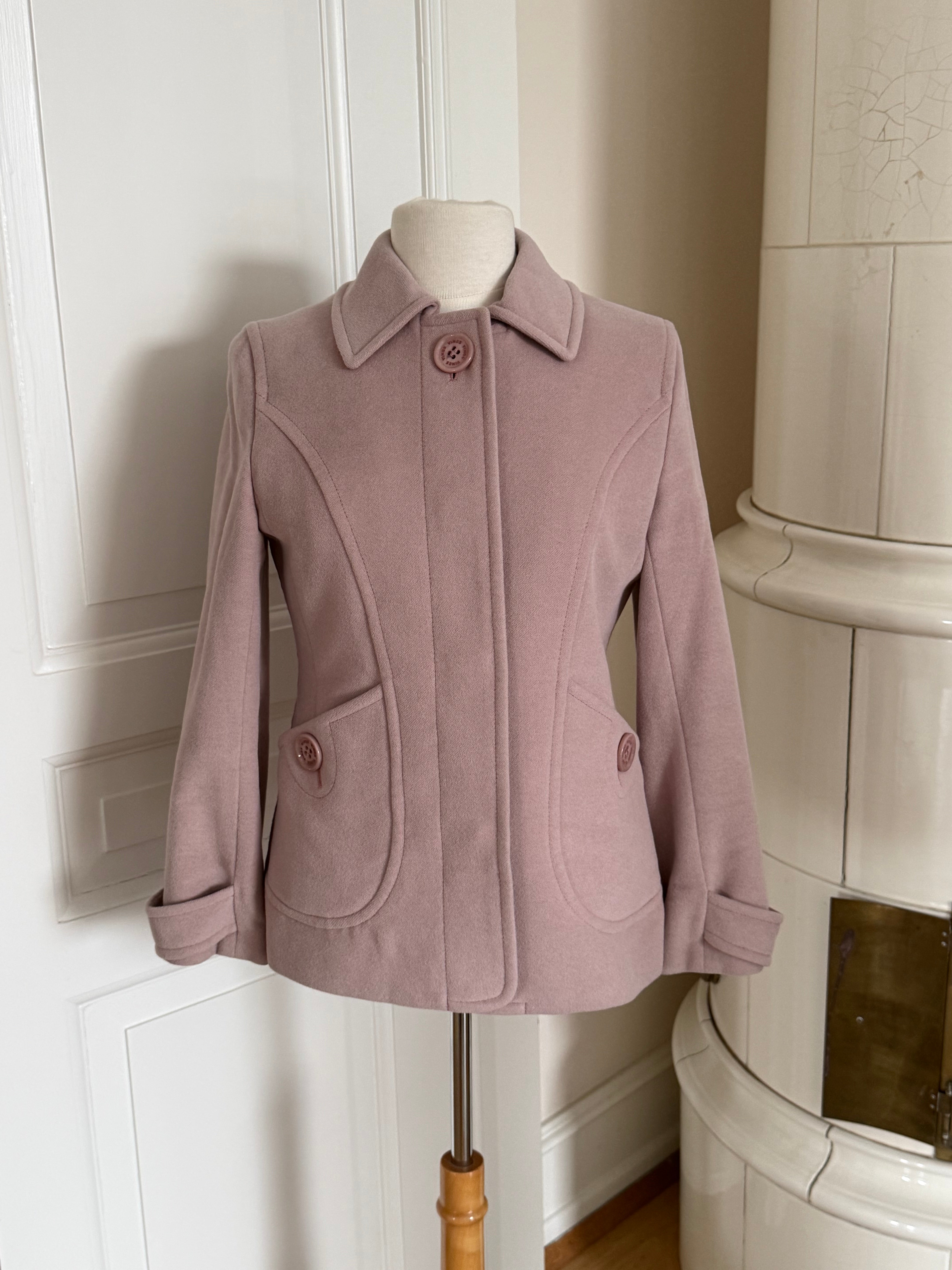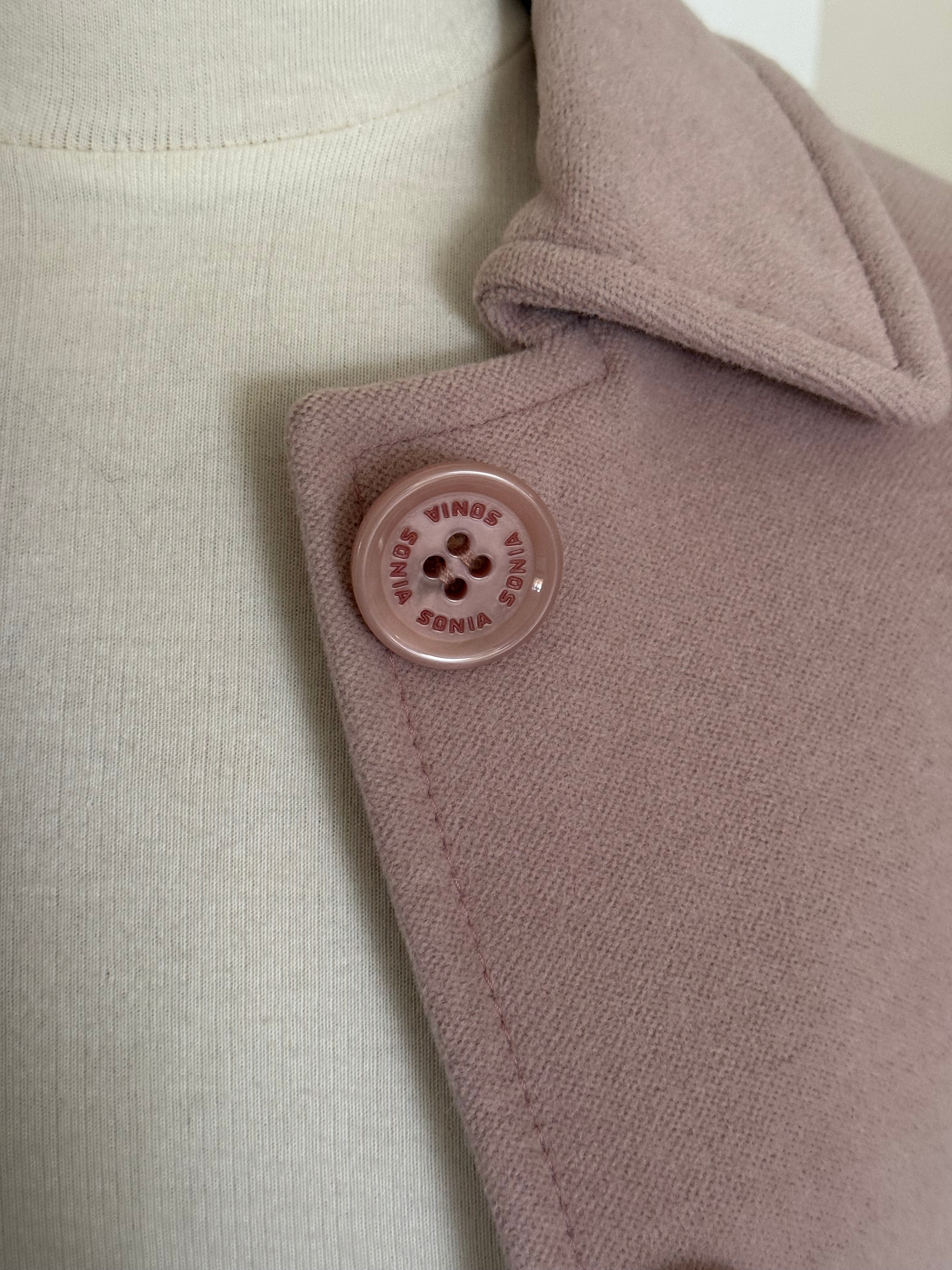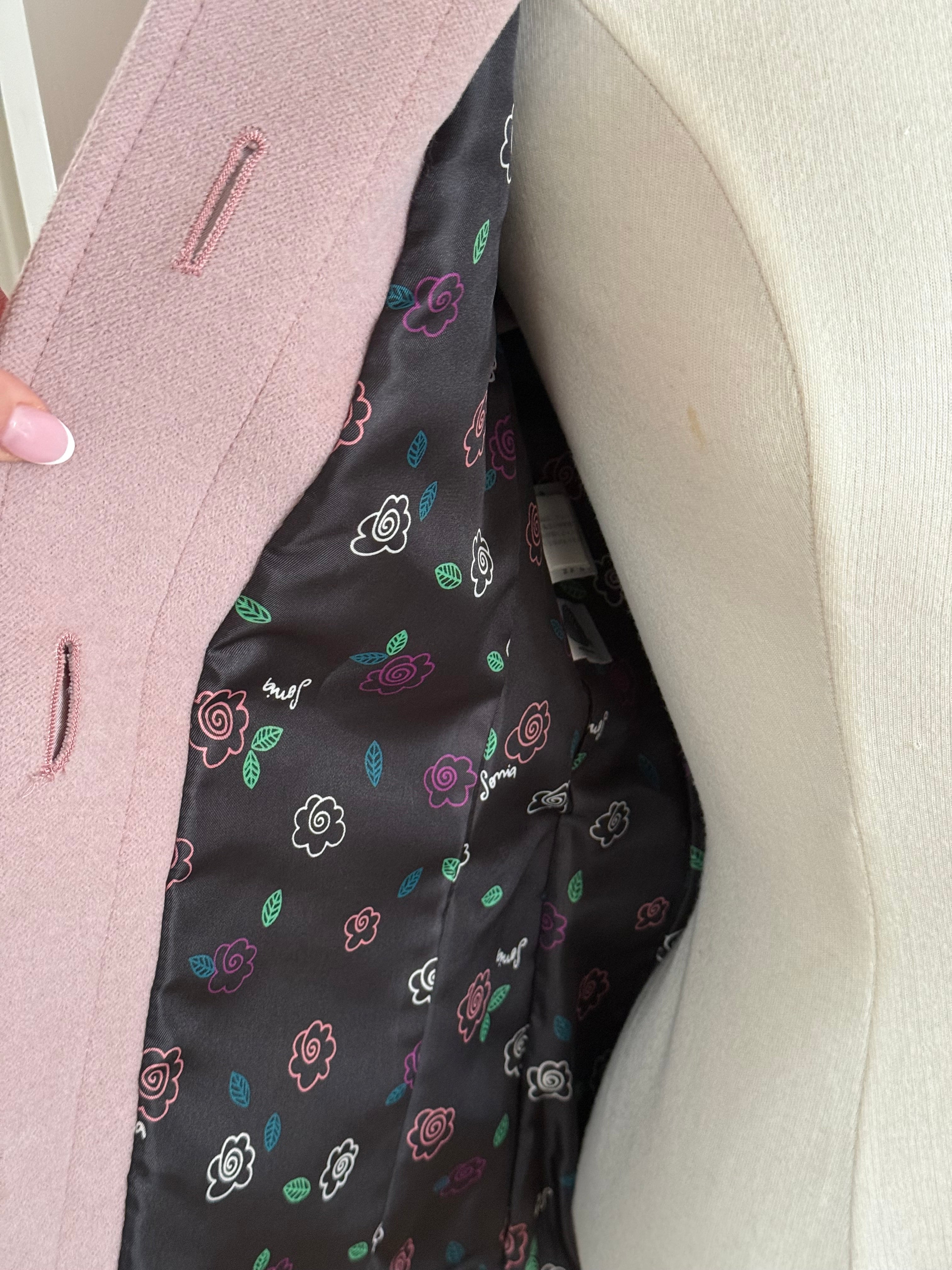 Vintage Sonia Rykiel jacket in soft blush pink wool with a clean, structured exterior. Designed with a fitted silhouette, classic collar and signature Sonia Rykiel buttons, with a floral lining inside.