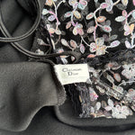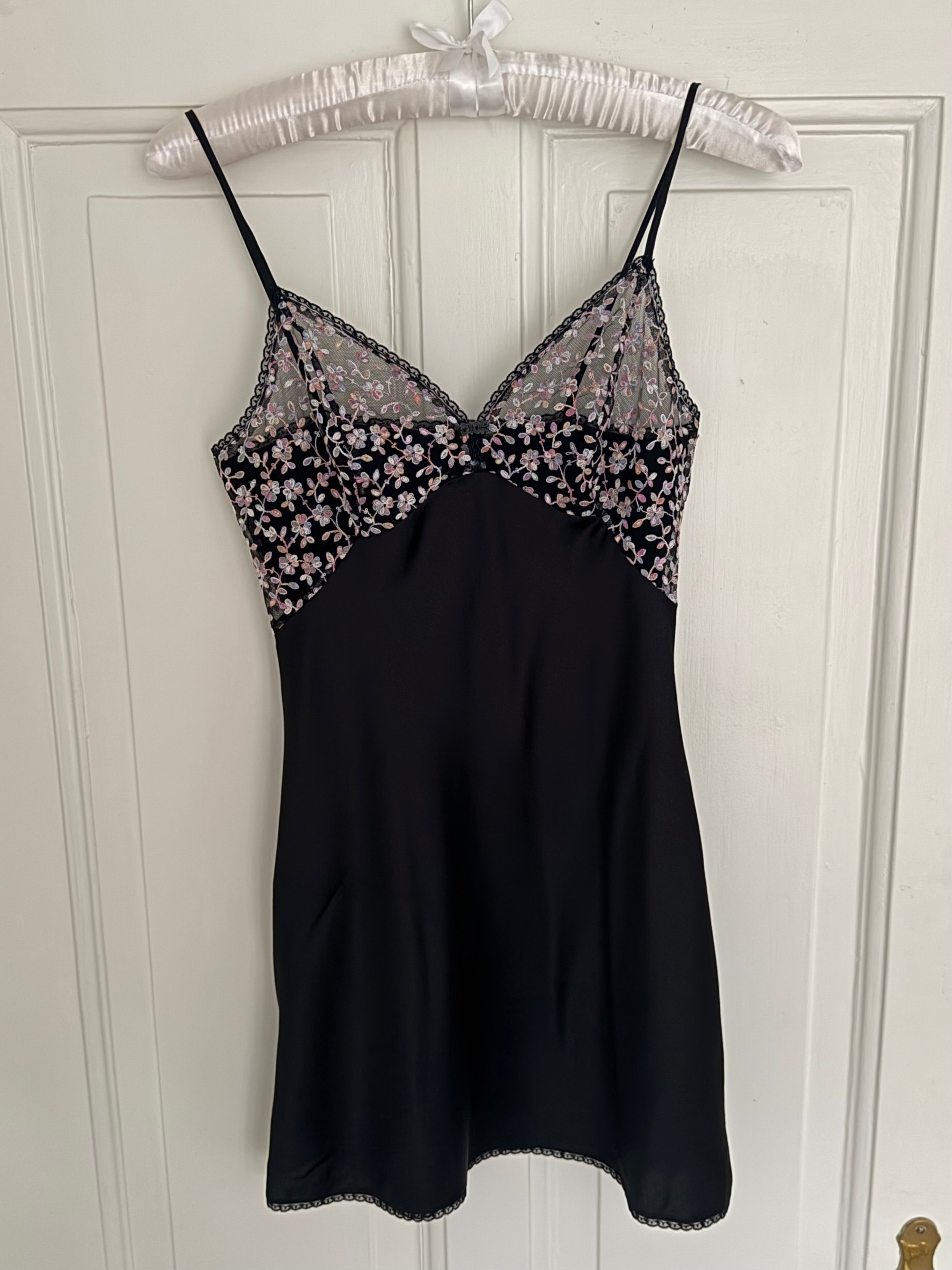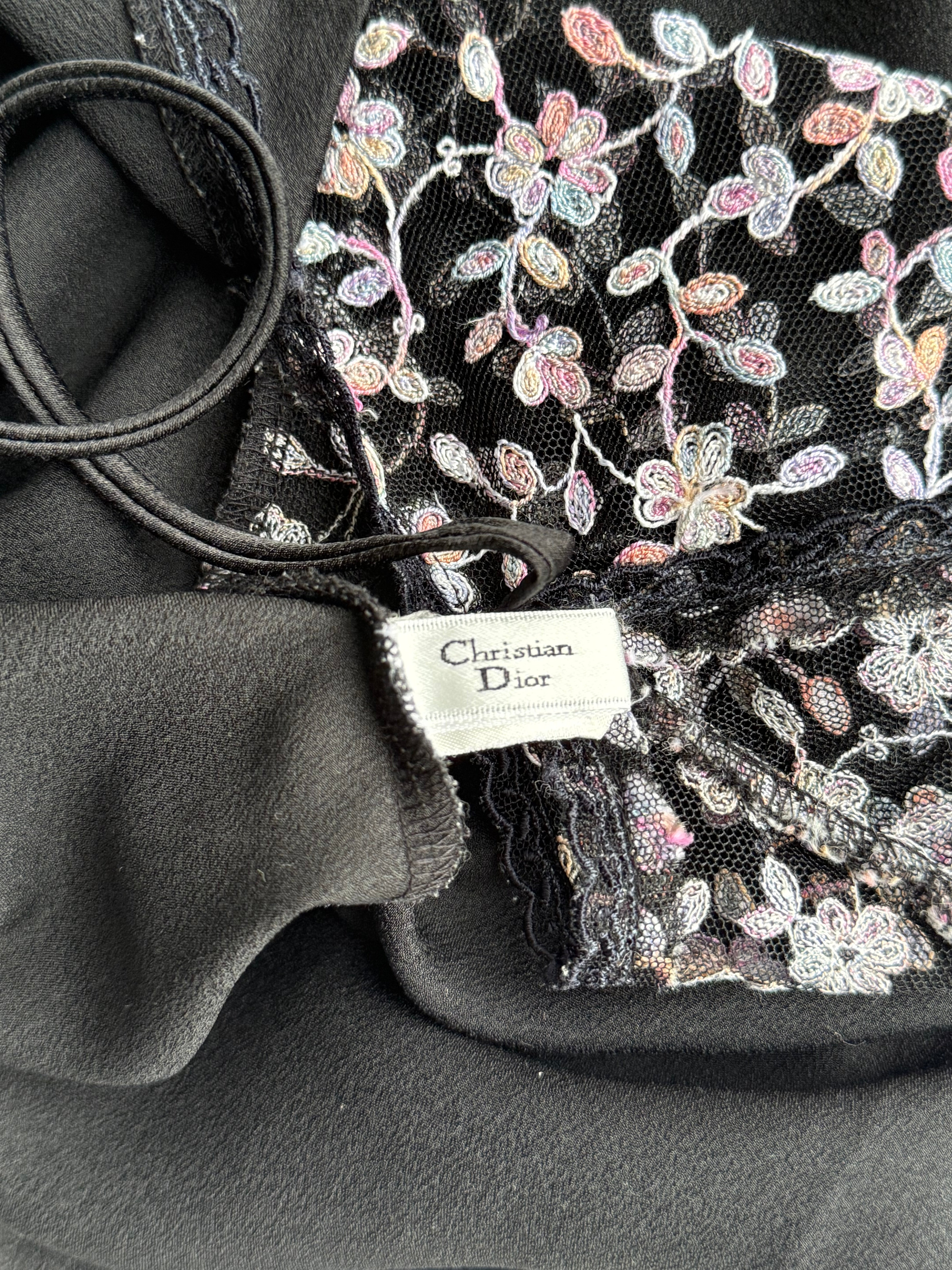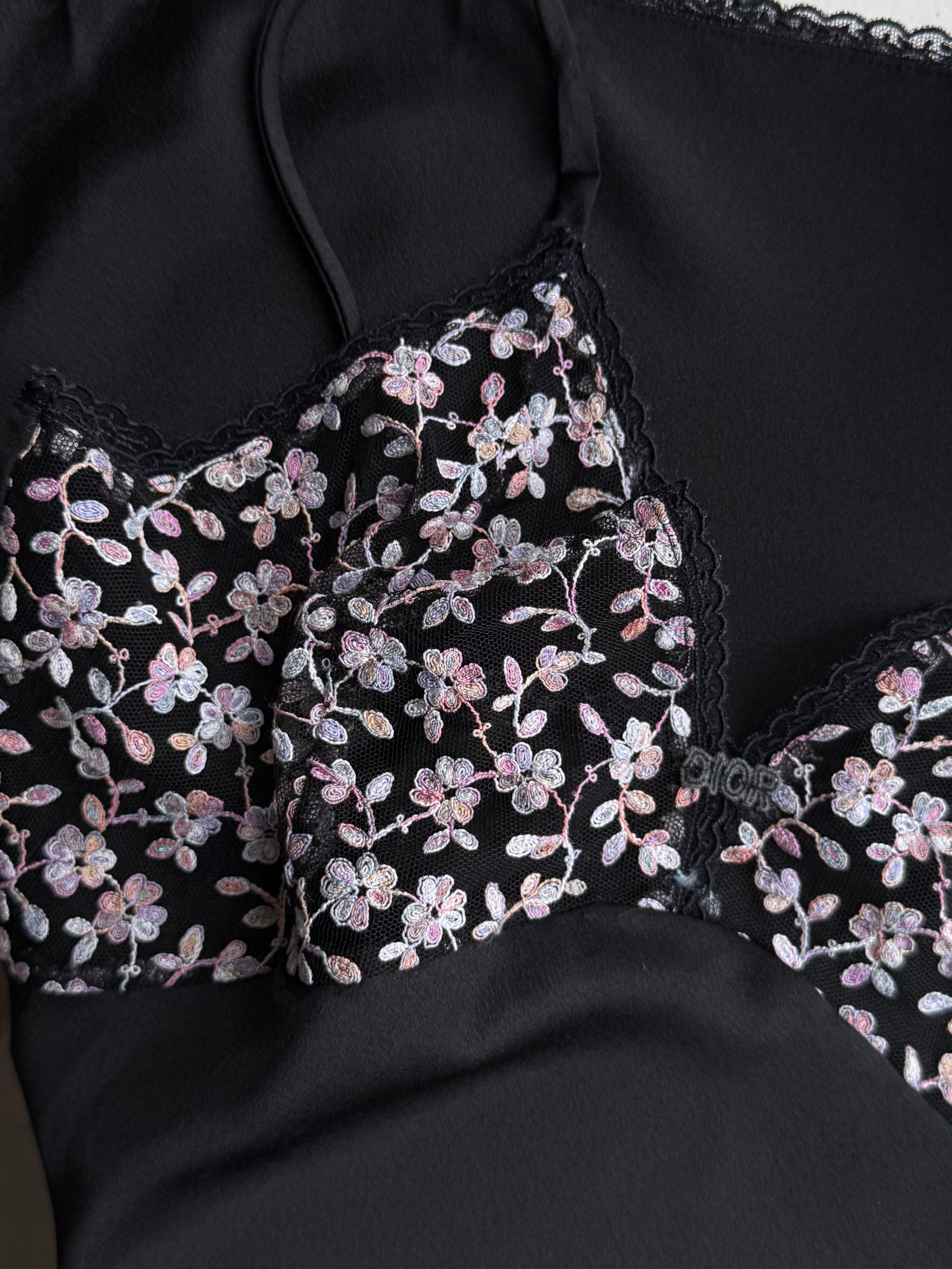 Vintage Christian Dior lingerie short slip dress in black, featuring the most beautiful multicolour floral lace detailing.