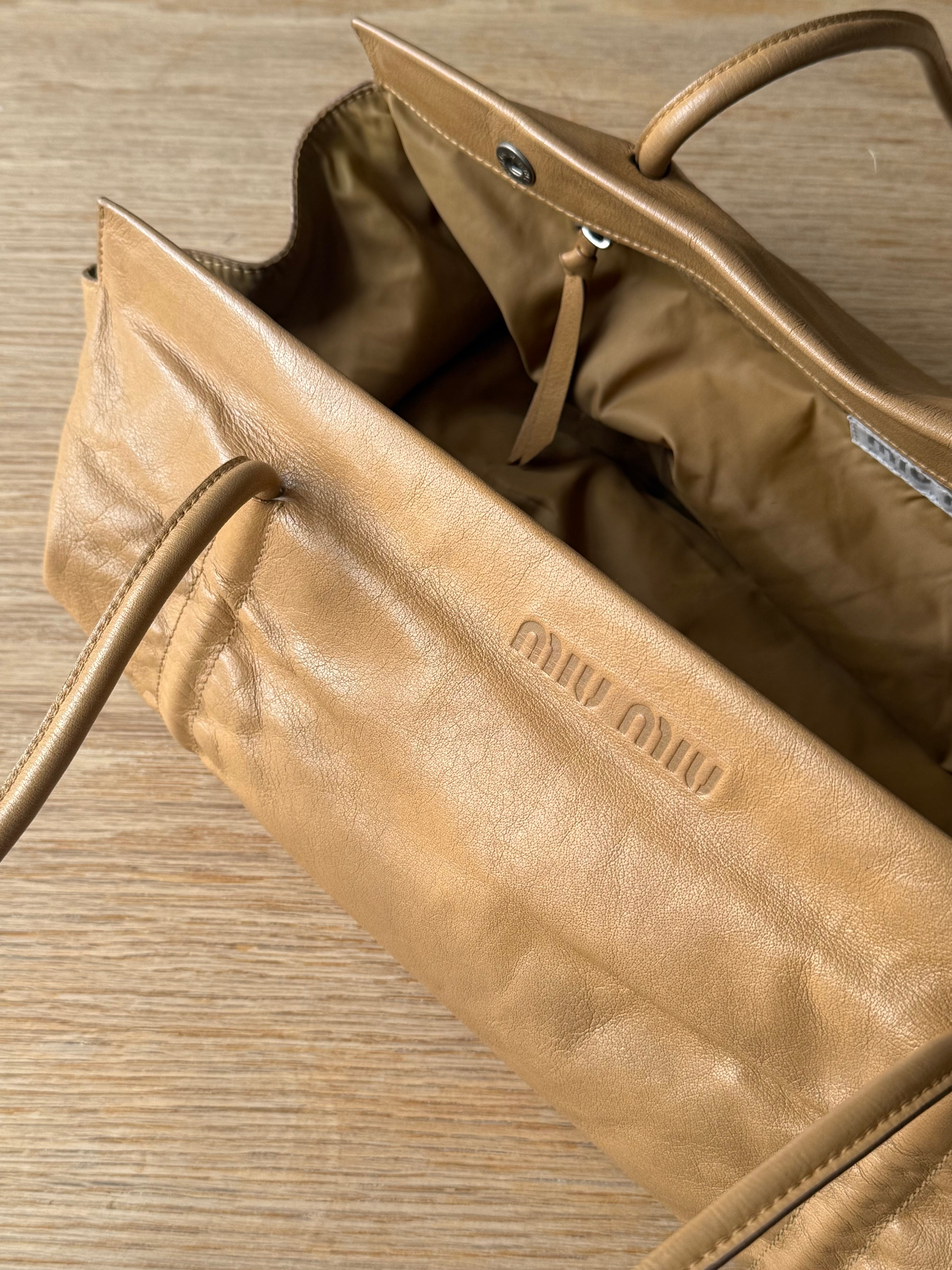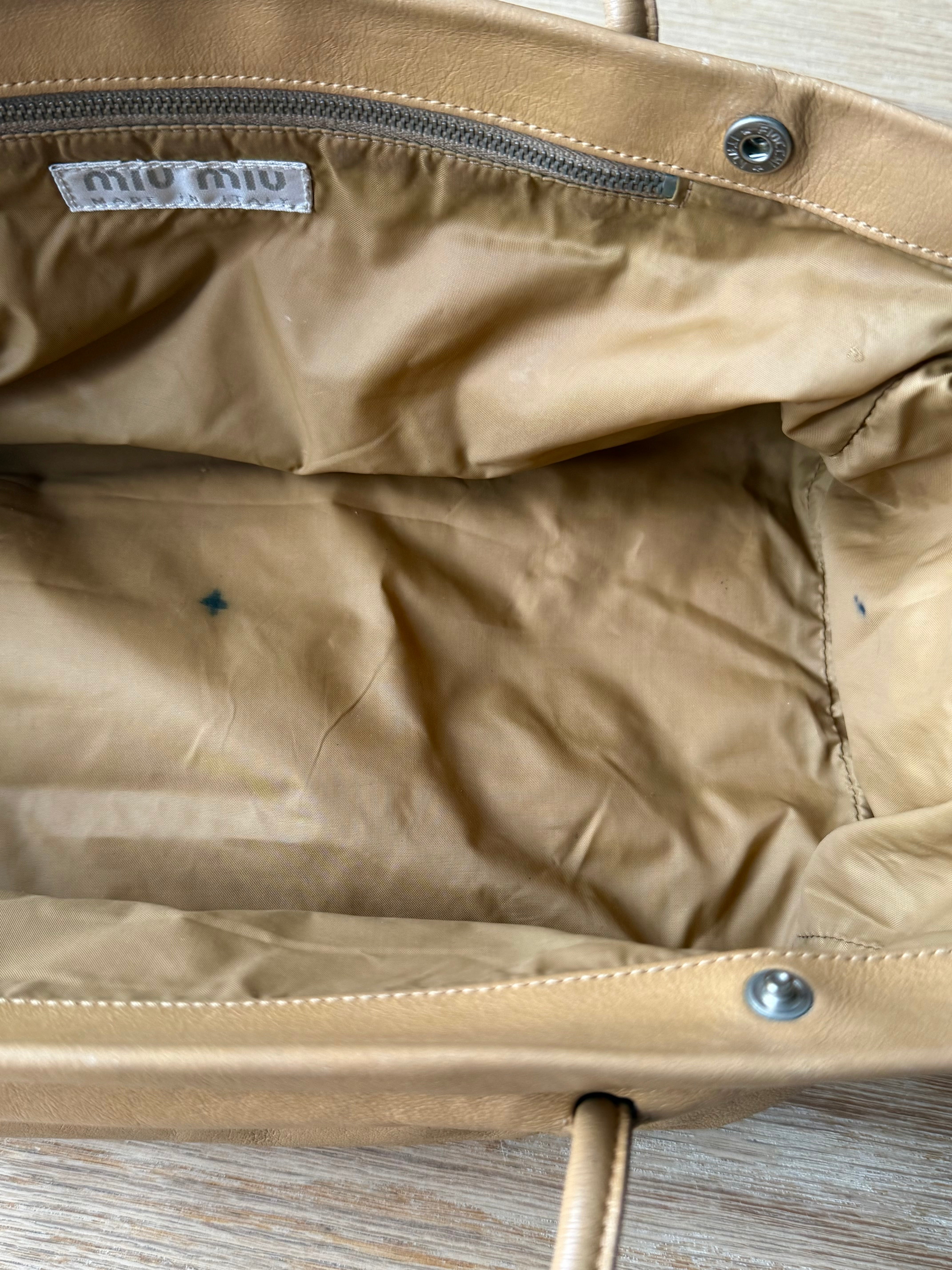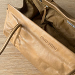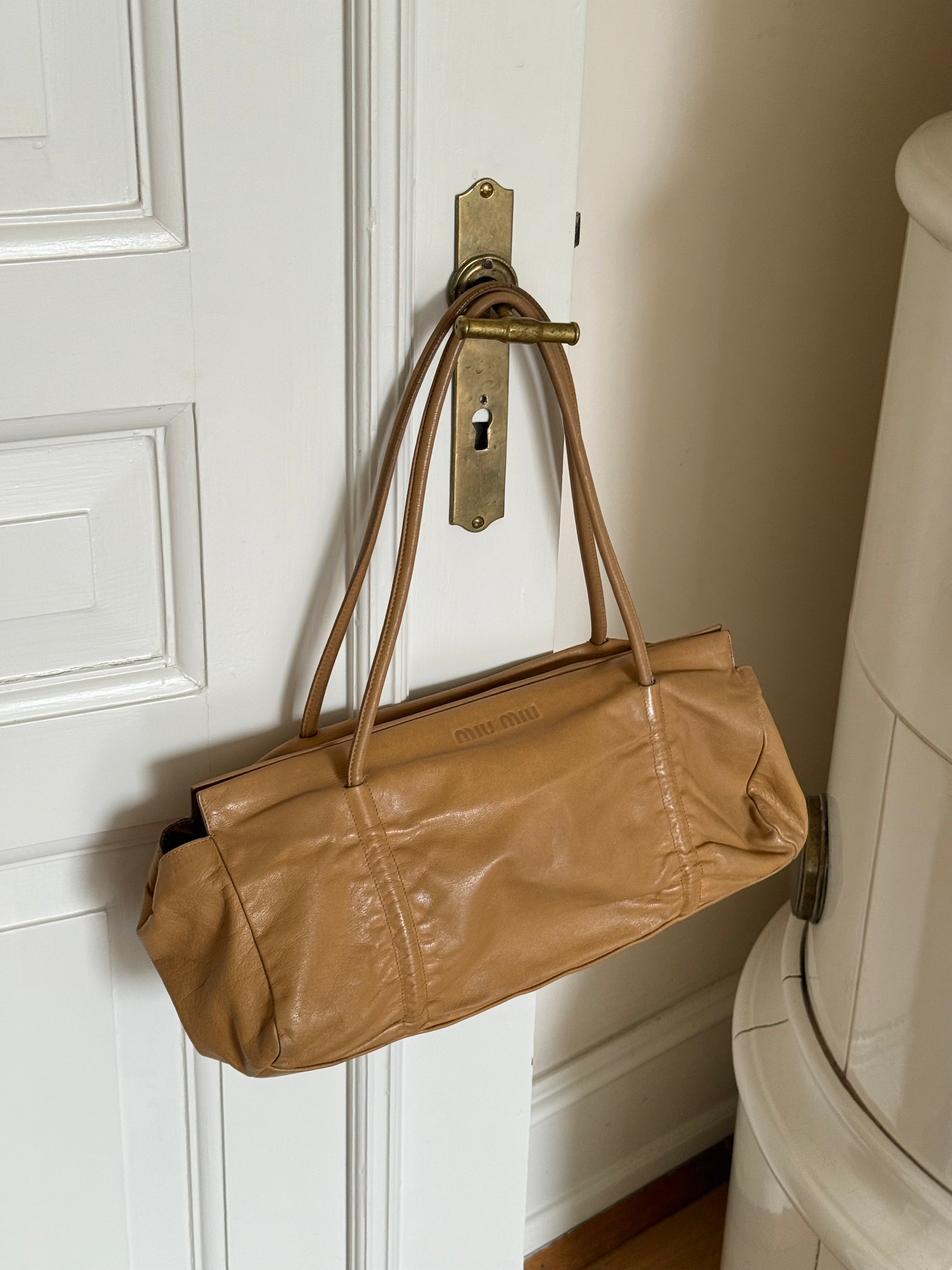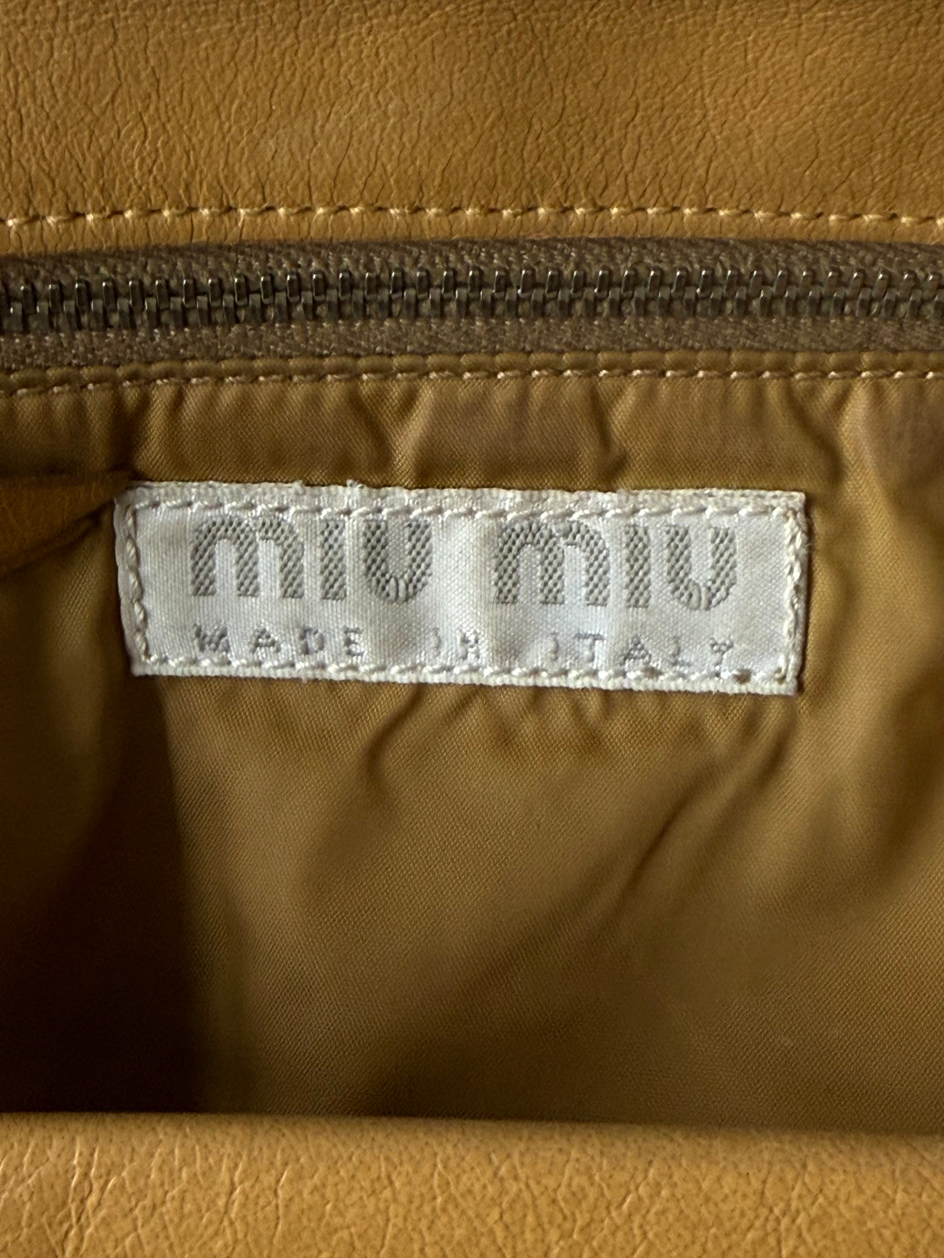 Rare archive Miu Miu shoulder bag in soft brown leather with embossed logo at the front and stud closure.