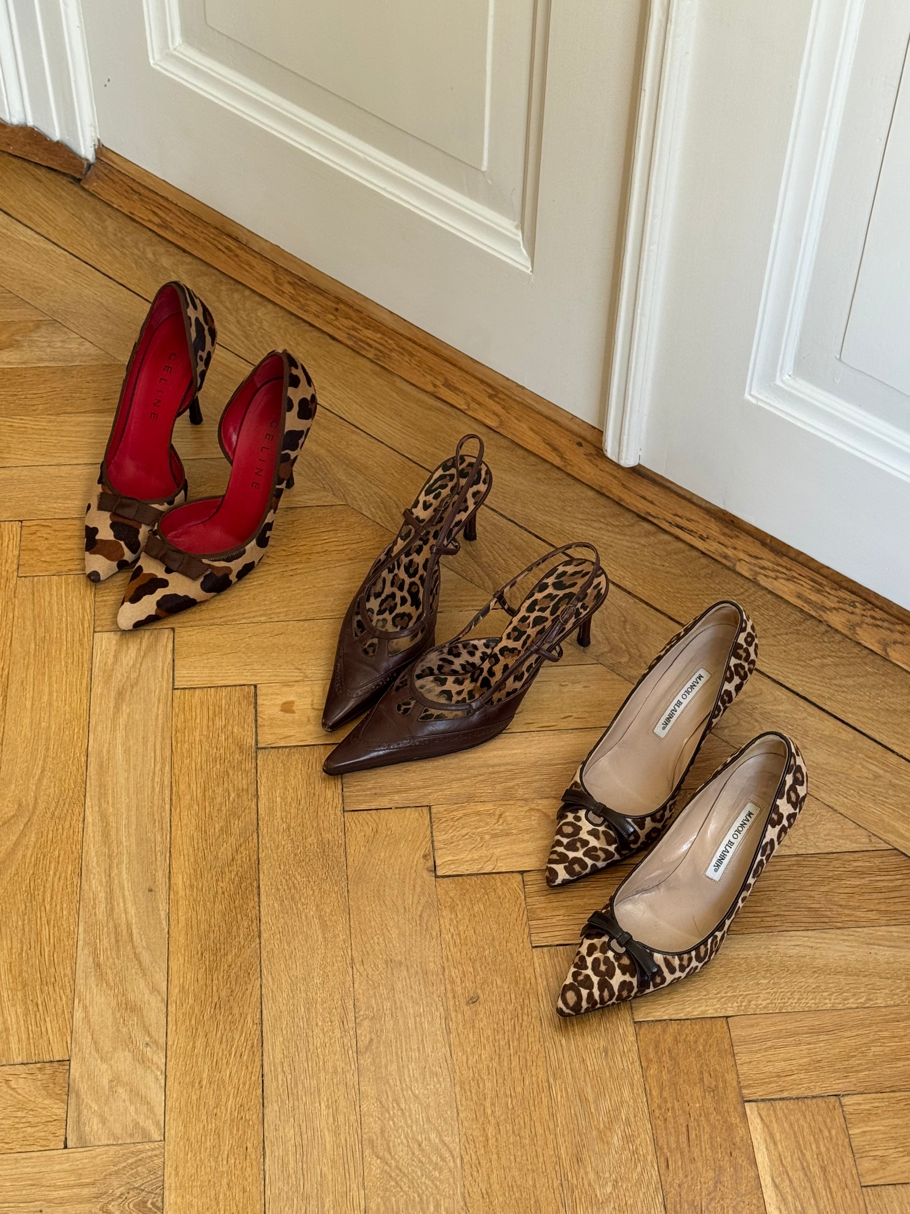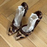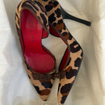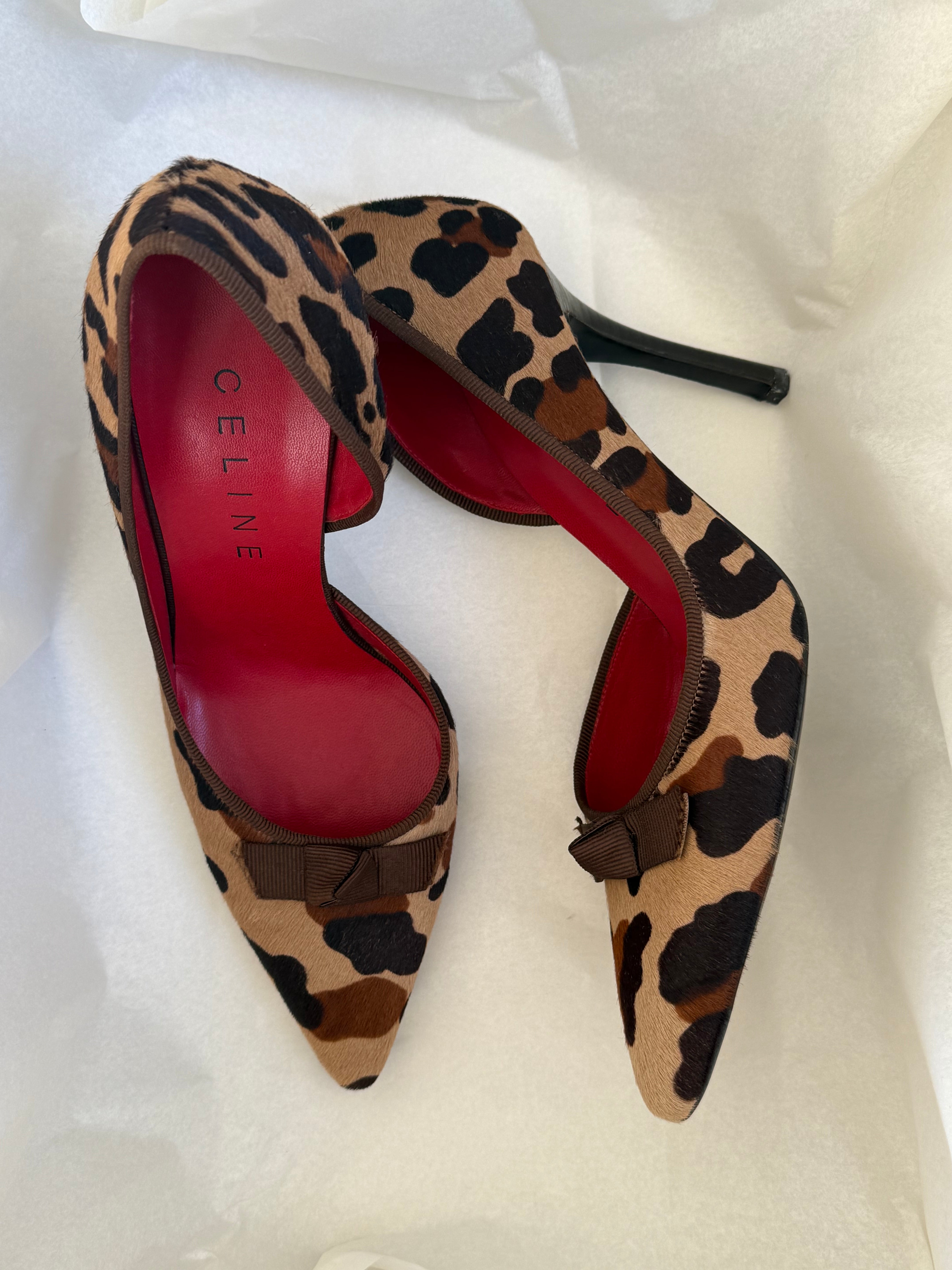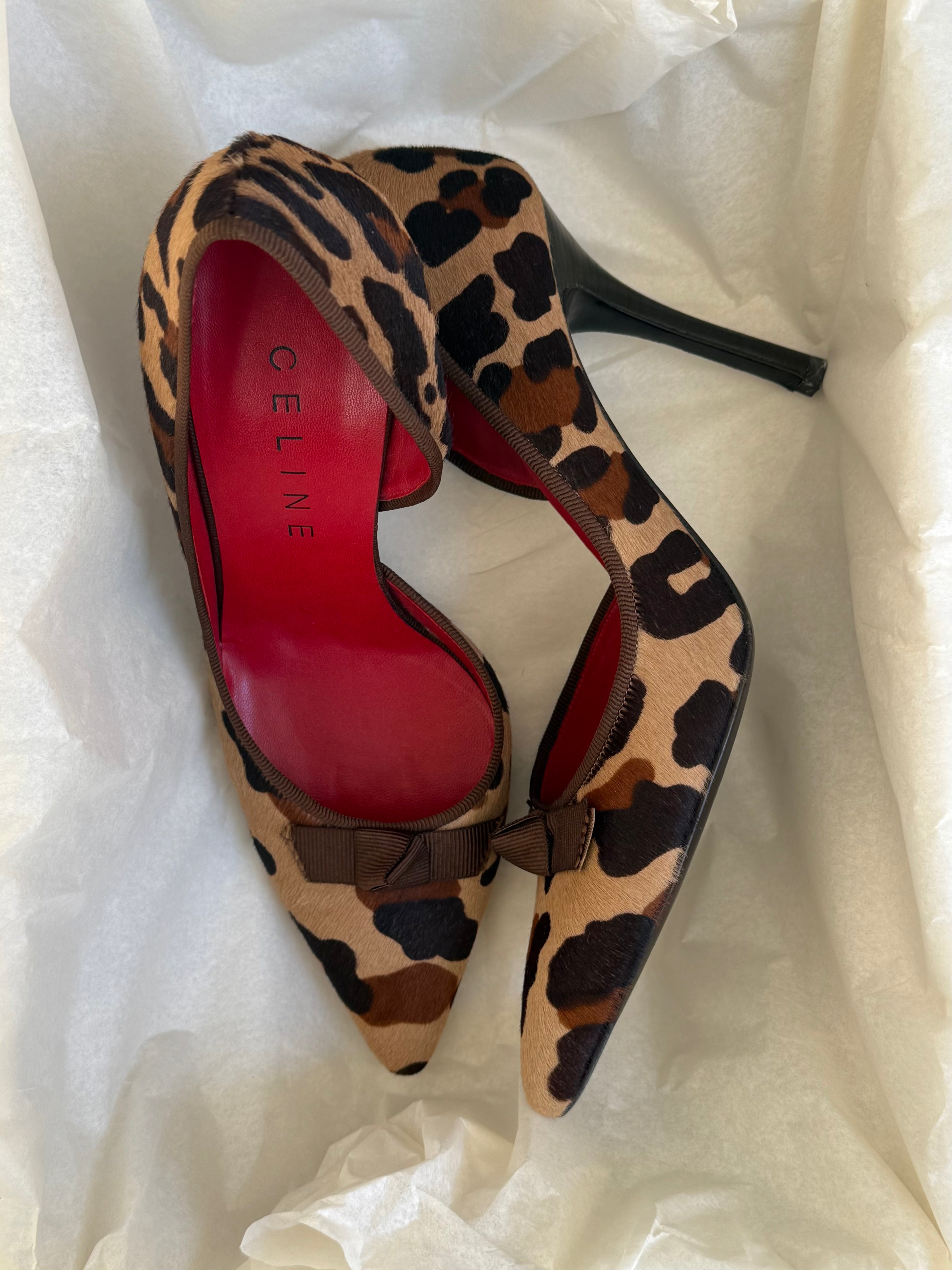 Stunning vintage Celine ponyhair leopard heels with iconic red insoles.
