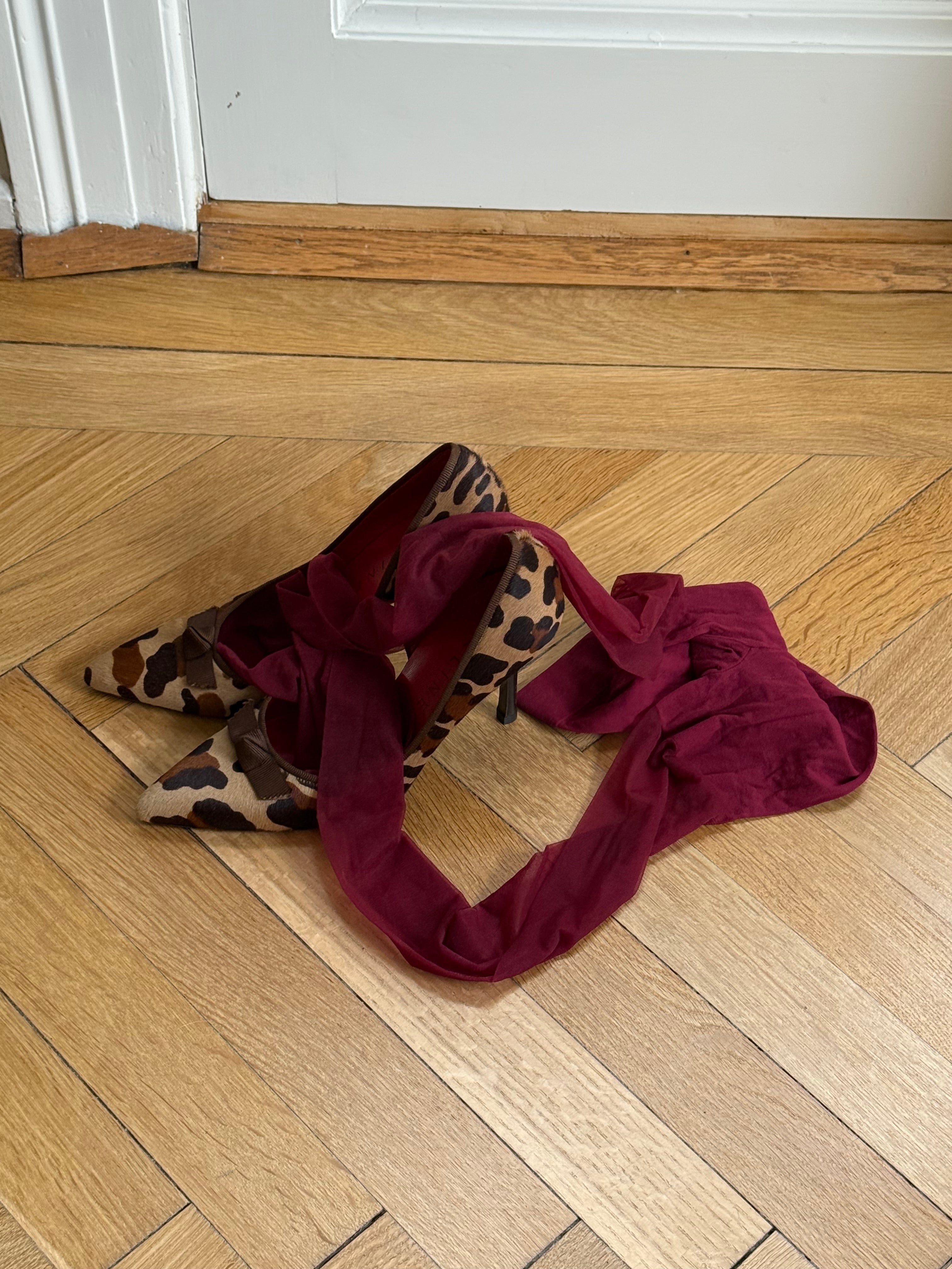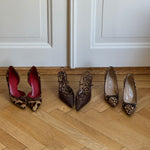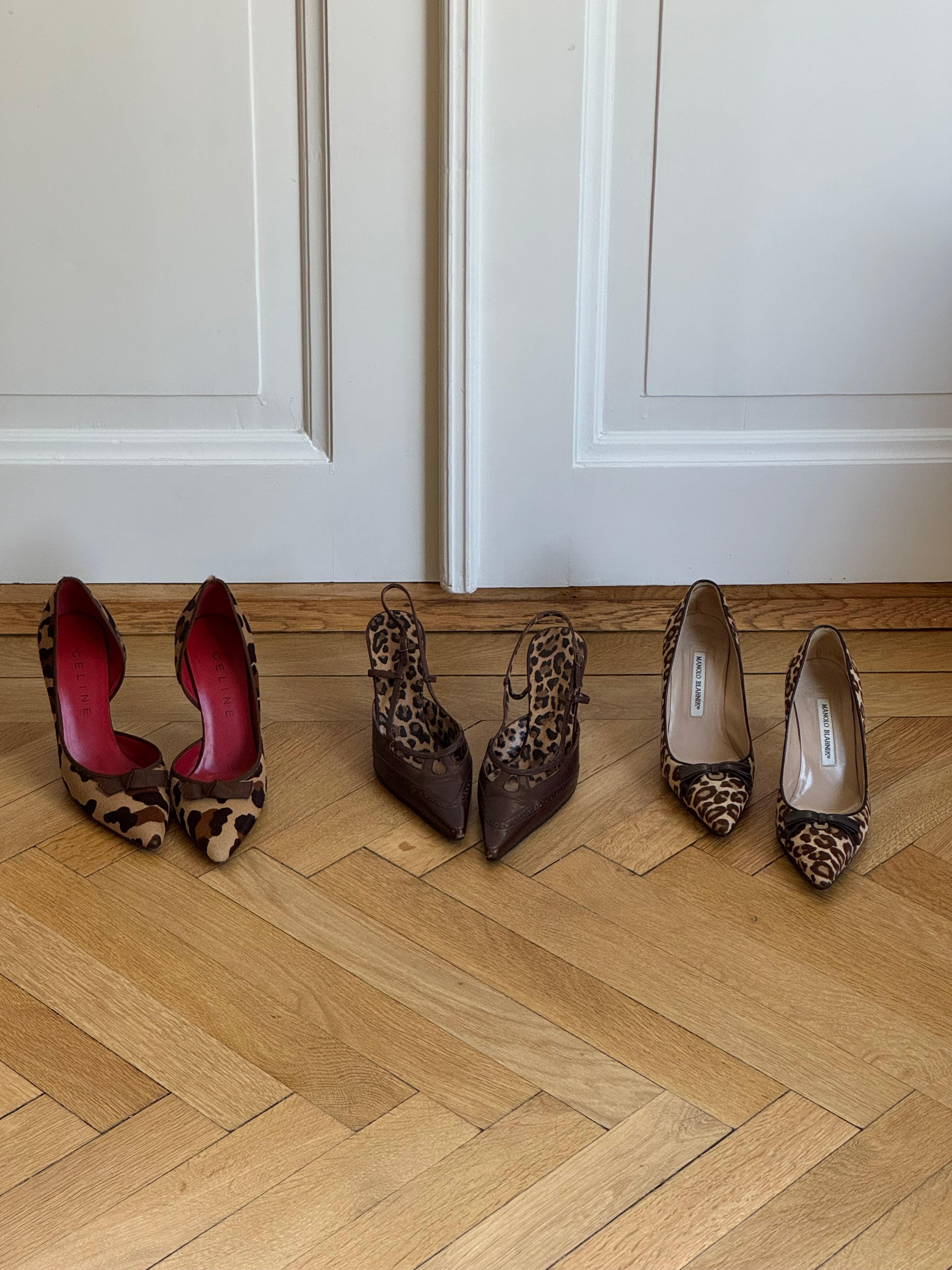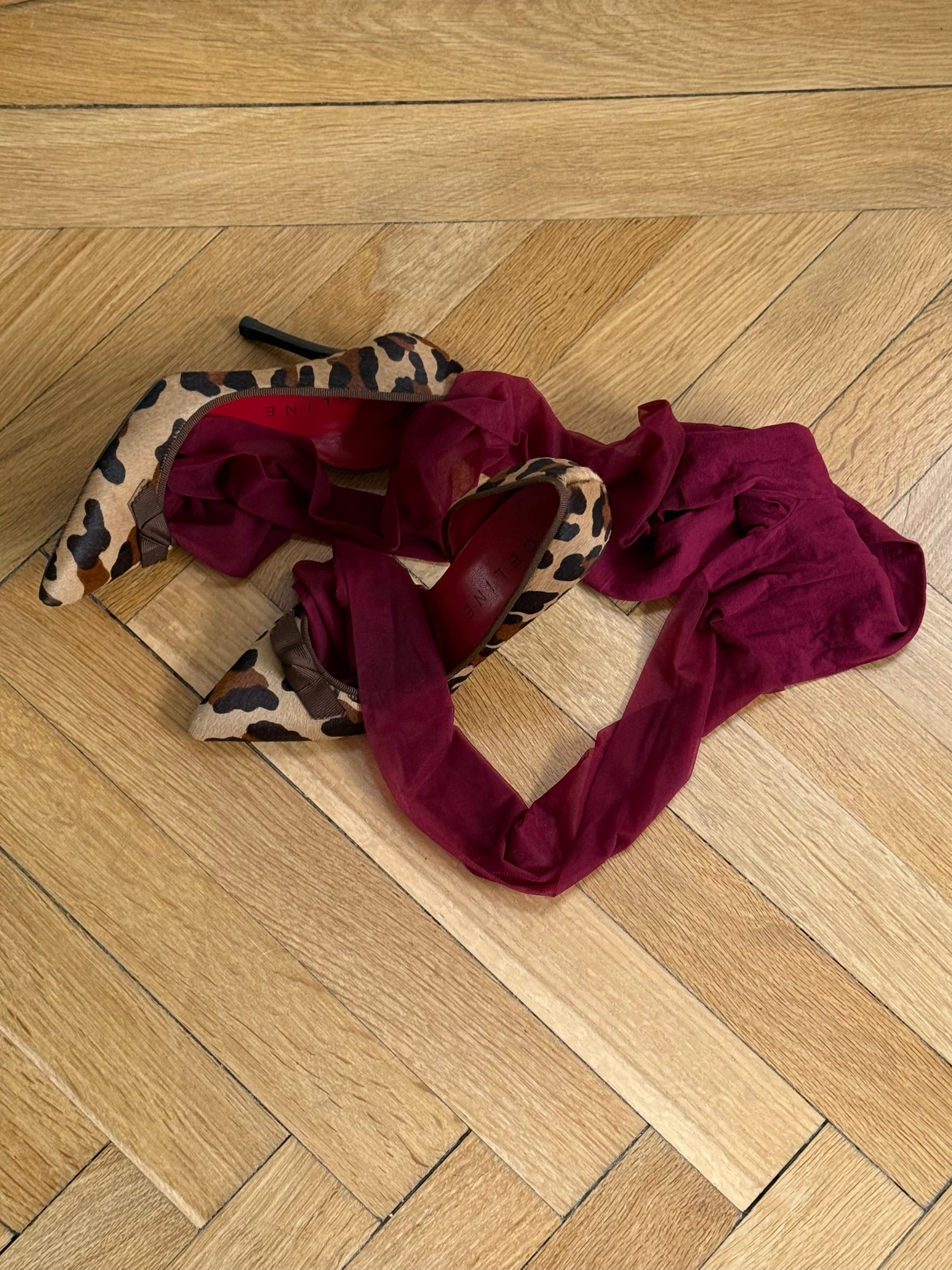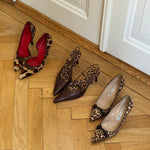 Stunning vintage Celine ponyhair leopard heels with iconic red insoles.