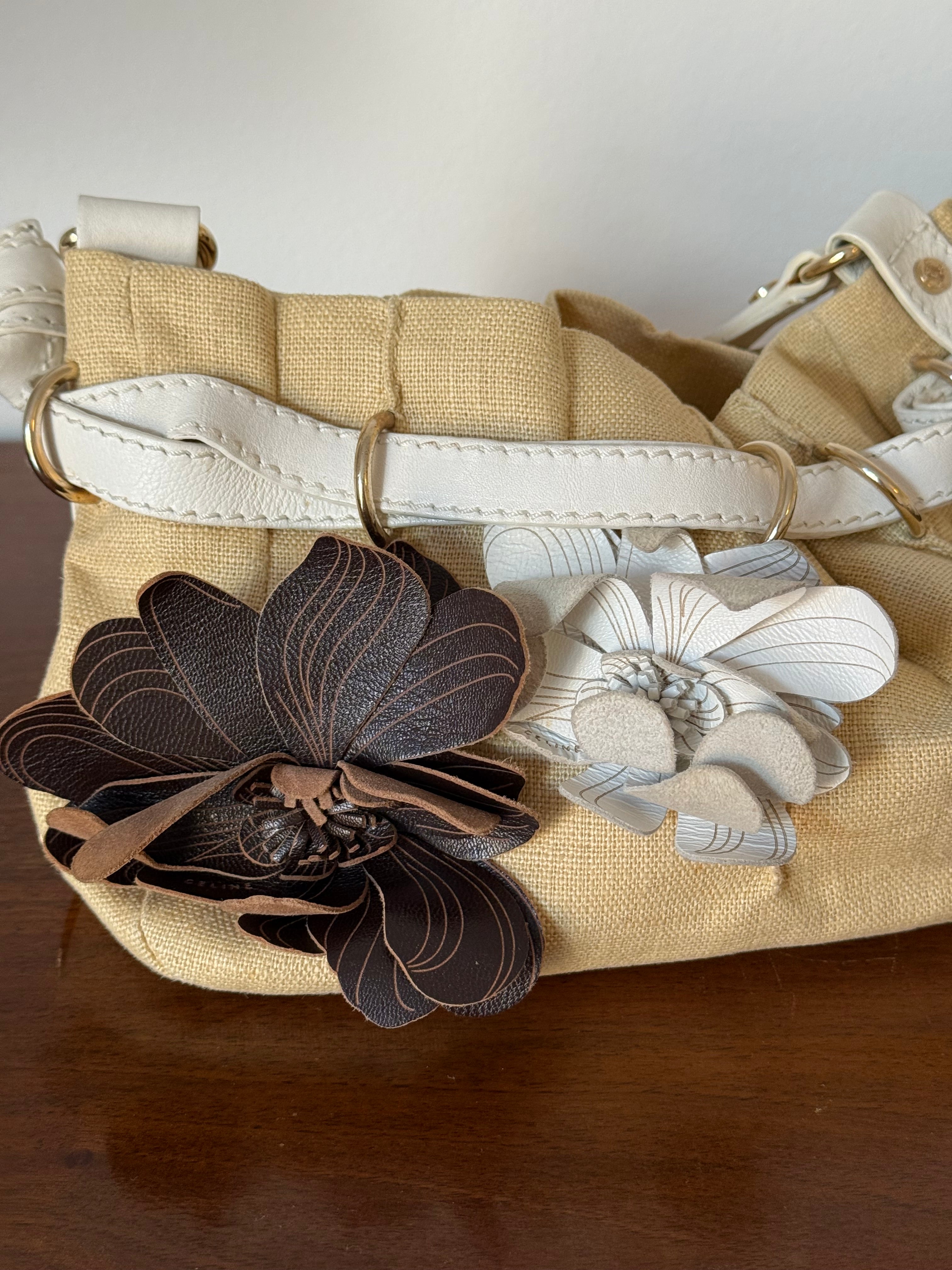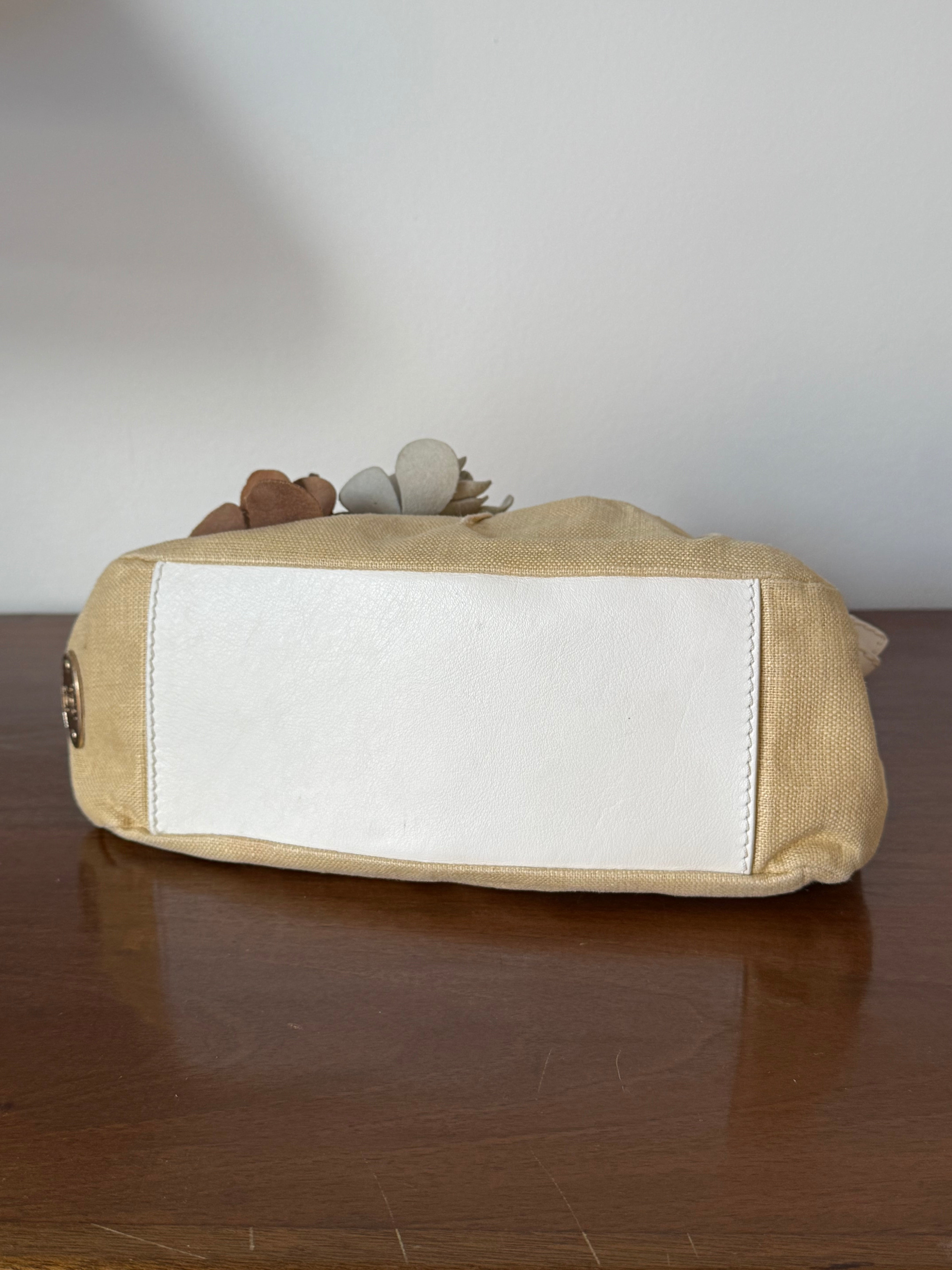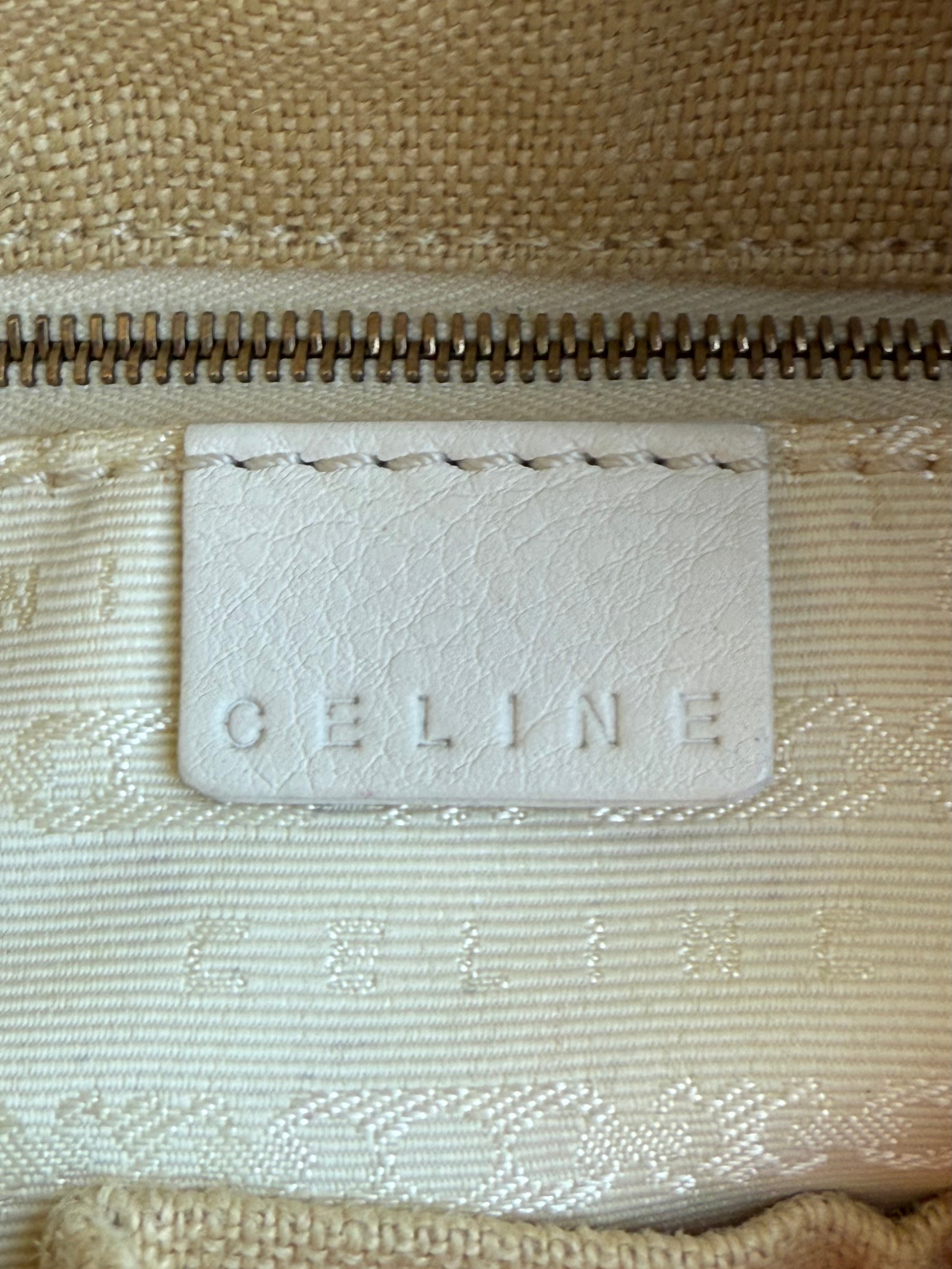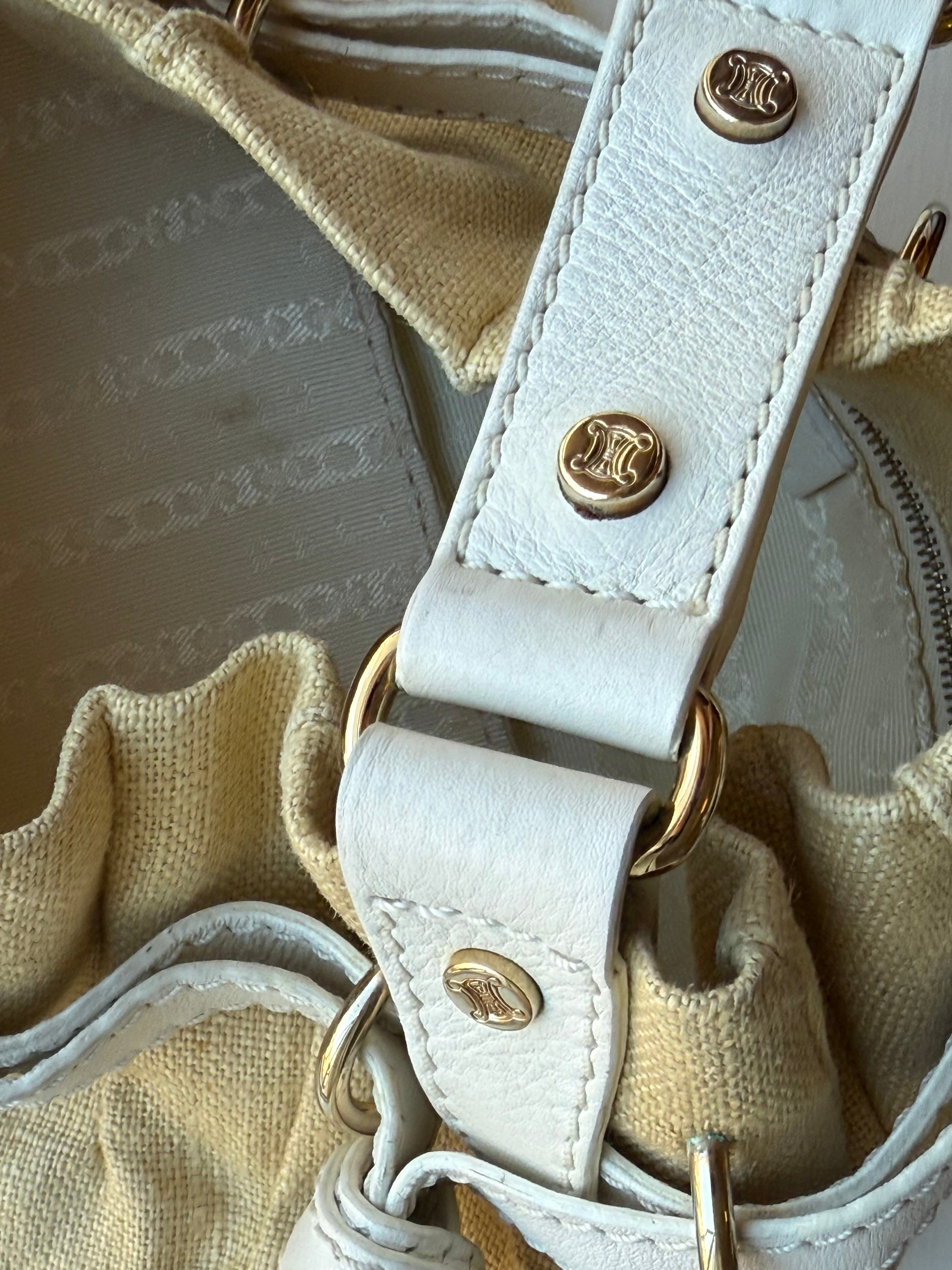 The most beautiful and rare vintage Celine mini bag in canvas and white leather. The bag features Triomphe studs and gold-tone hardware. The detachable leather flowers can be worn separately or repositioned on the bag. It is in very good vintage condition and includes one zippered pocket inside.