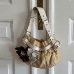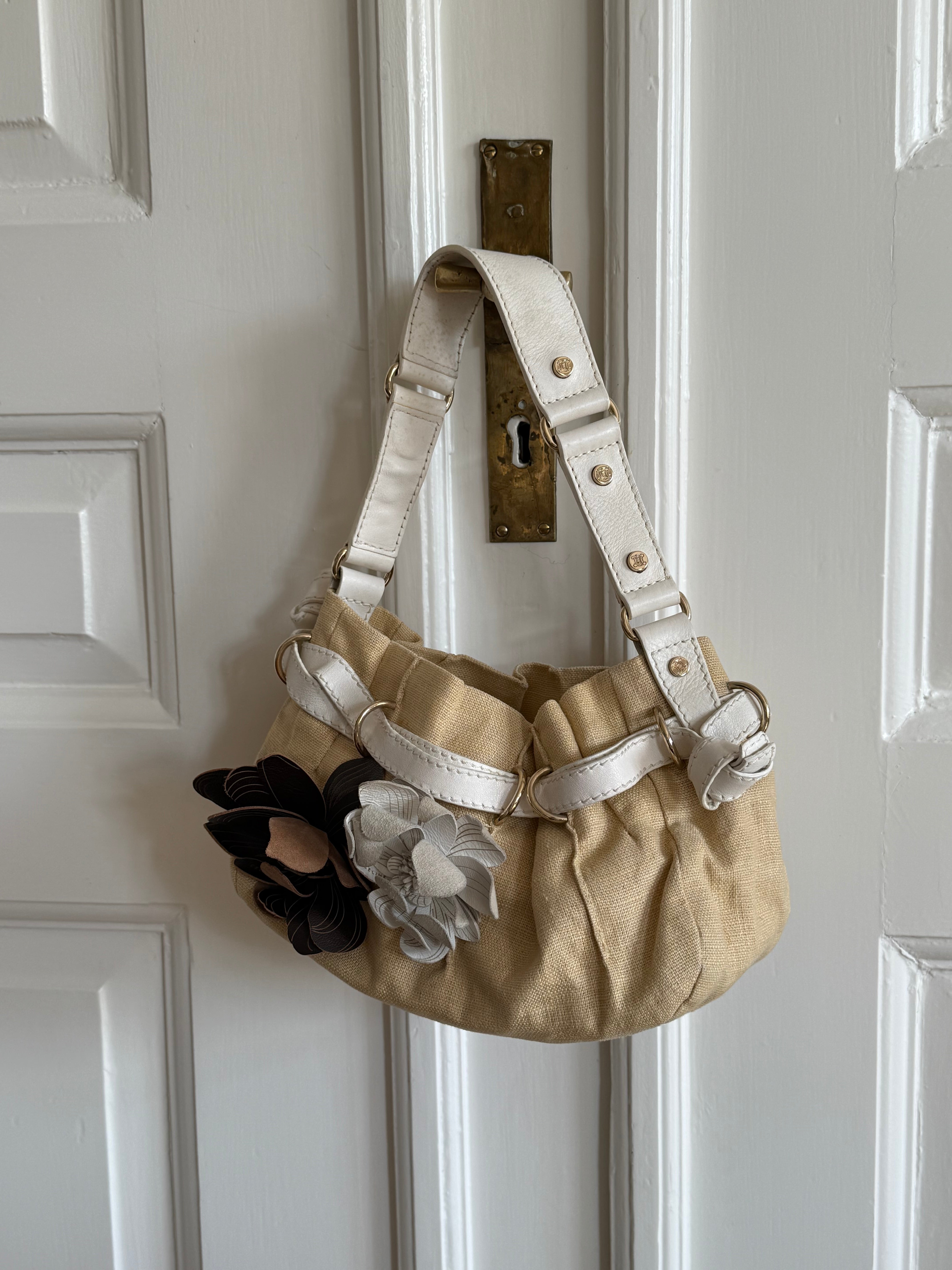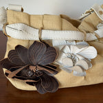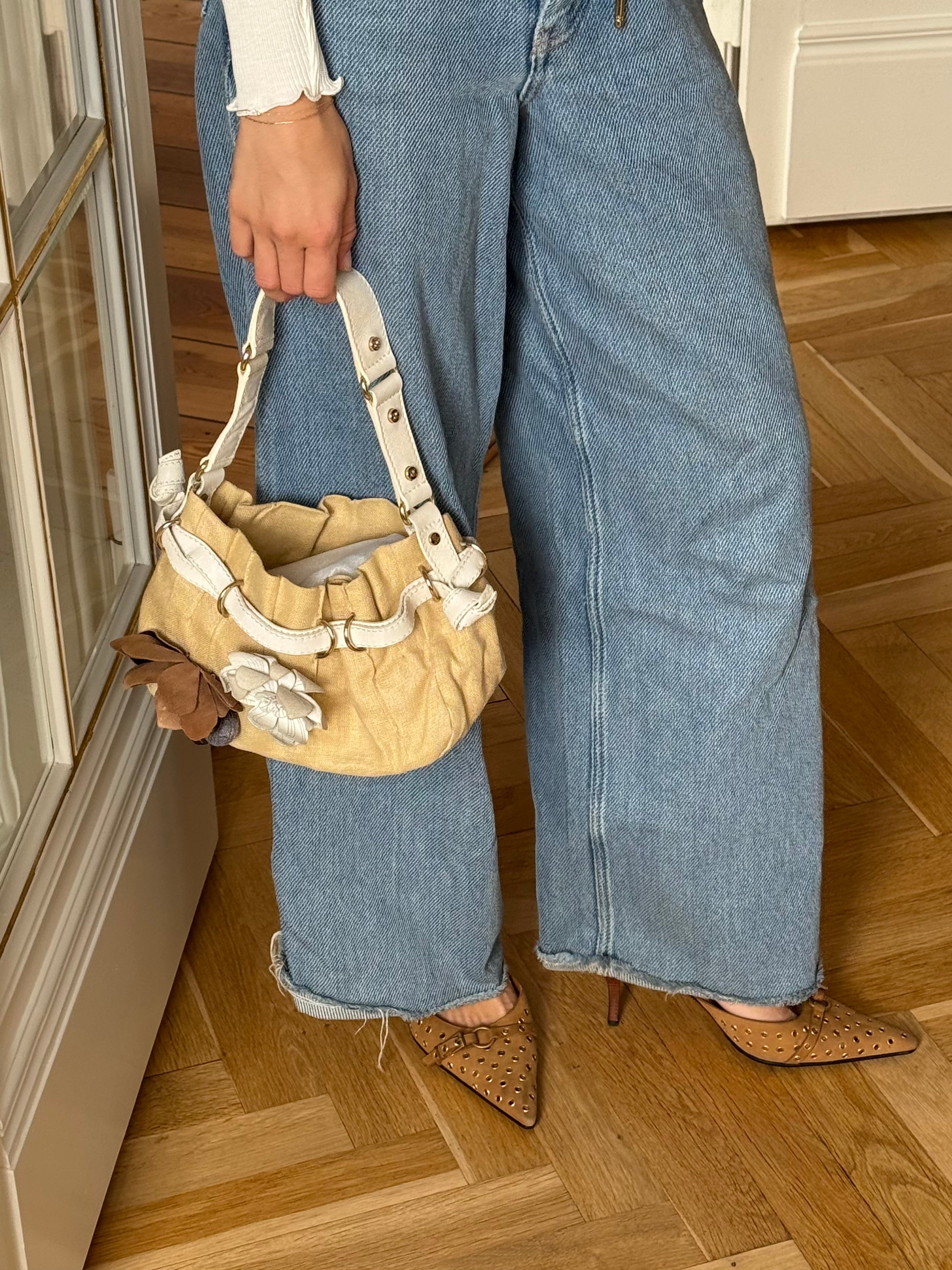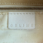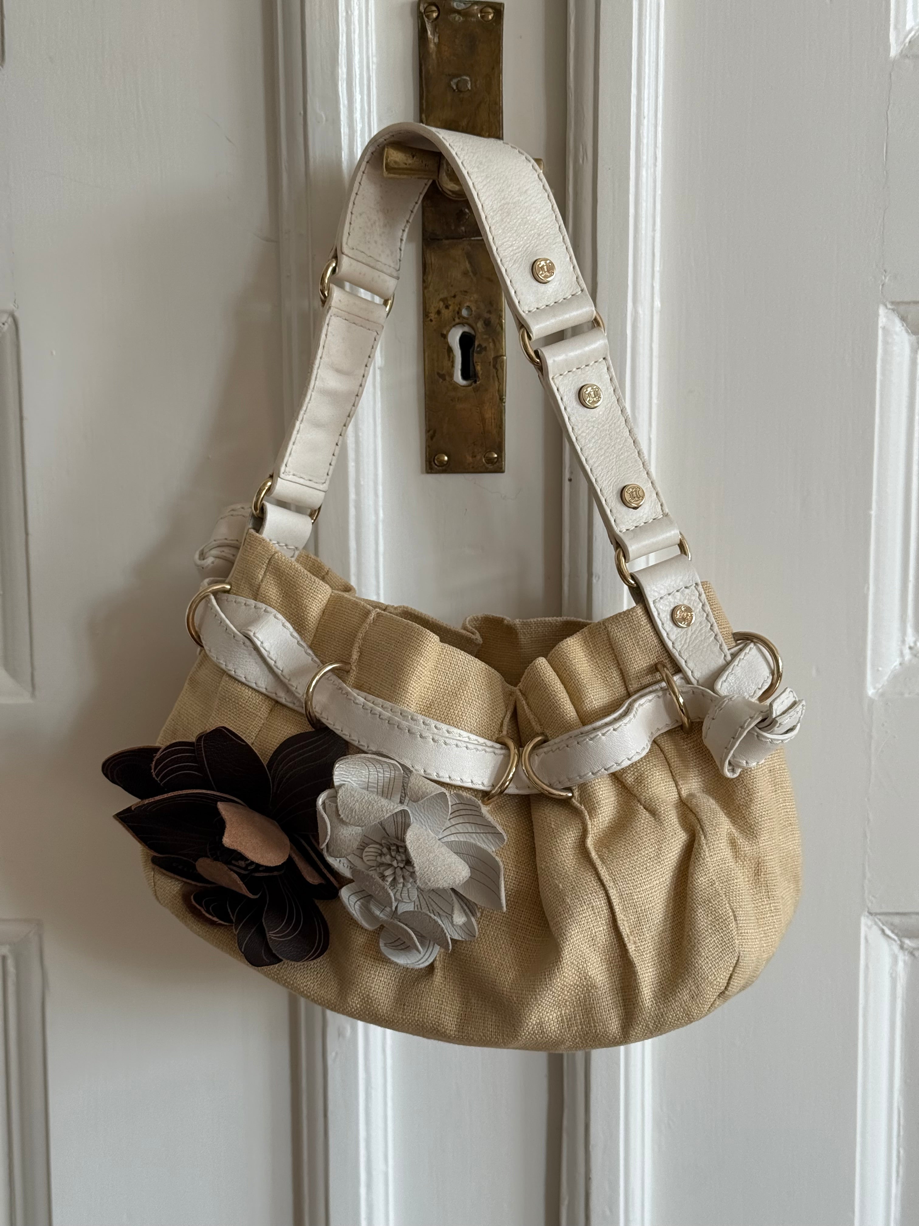 The most beautiful and rare vintage Celine mini bag in canvas and white leather. The bag features Triomphe studs and gold-tone hardware. The detachable leather flowers can be worn separately or repositioned on the bag. It is in very good vintage condition and includes one zippered pocket inside.