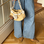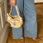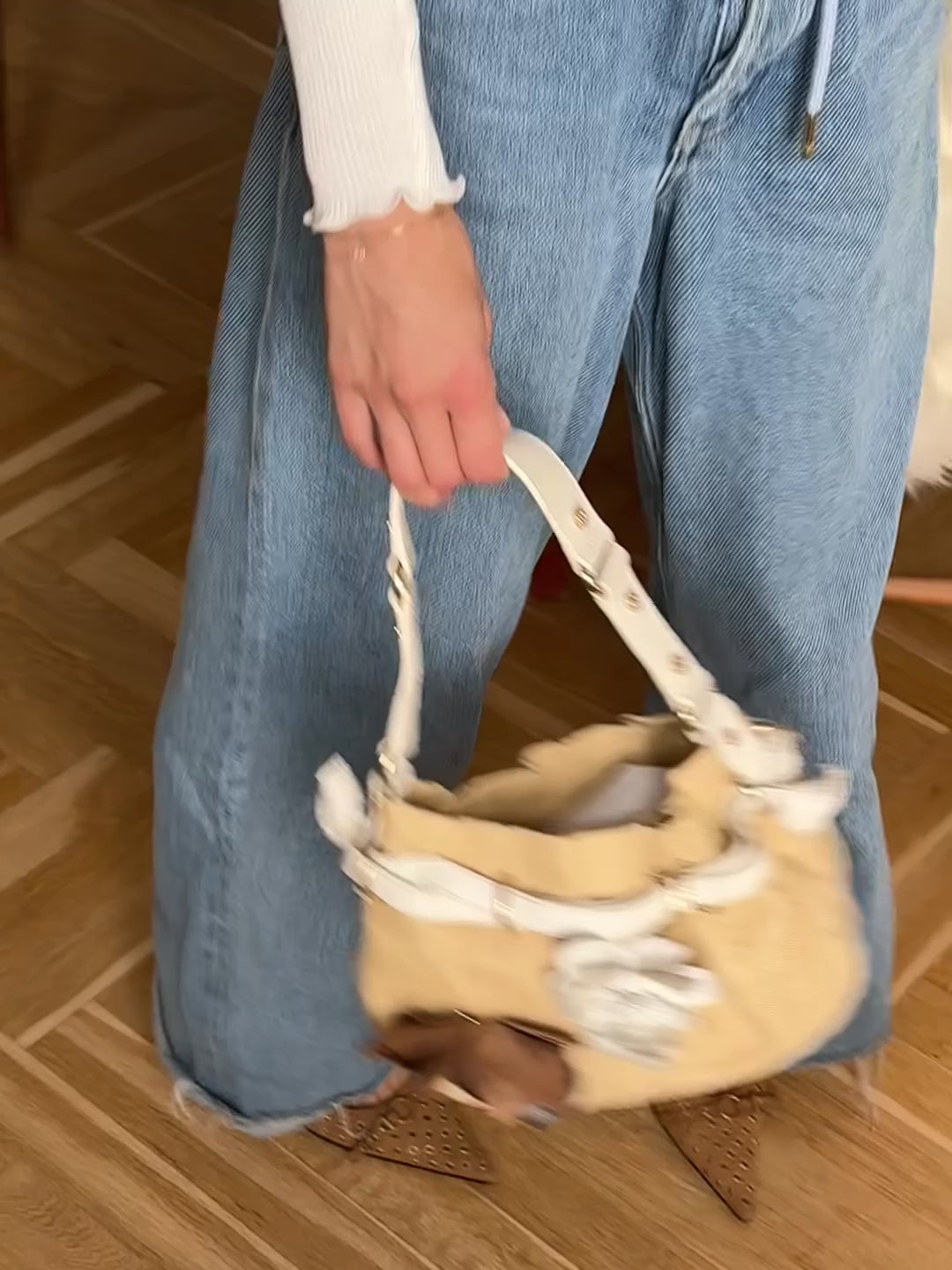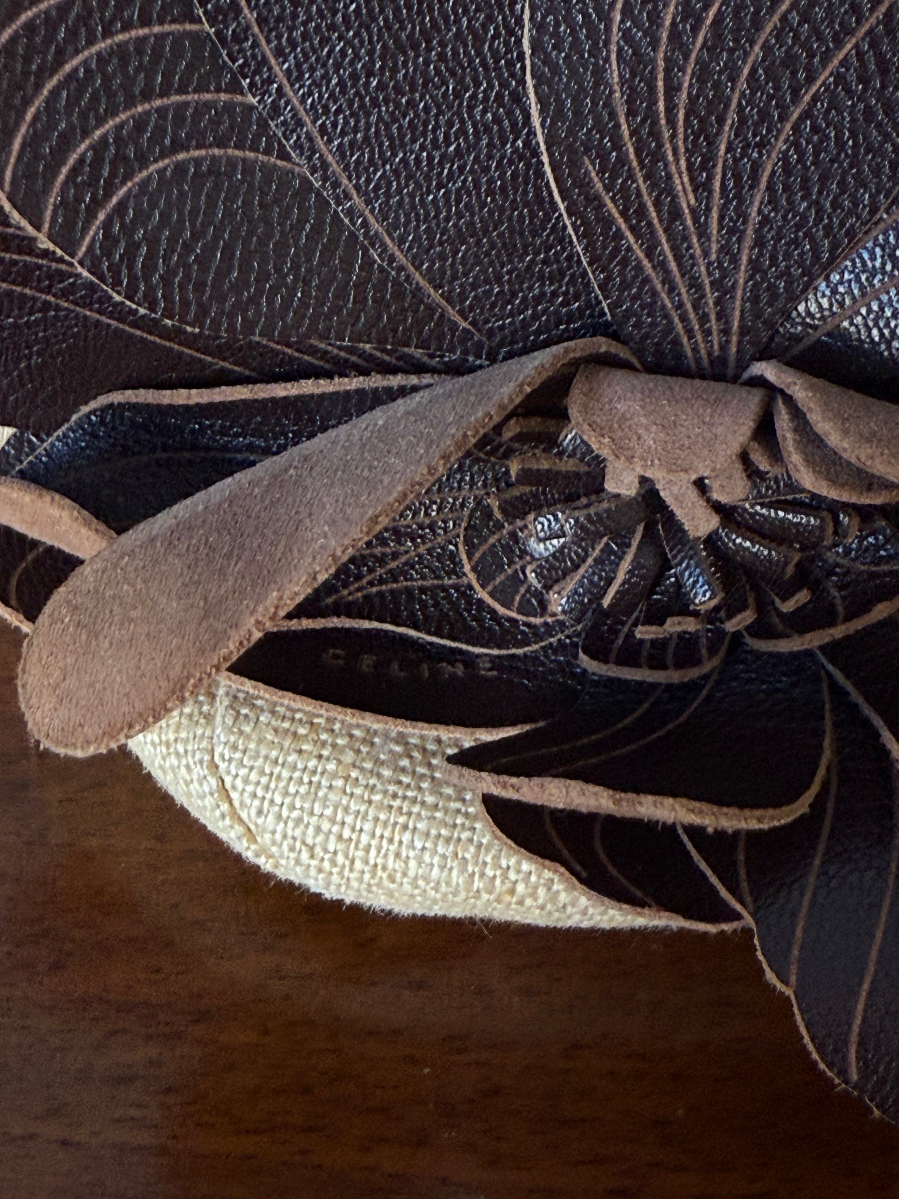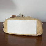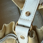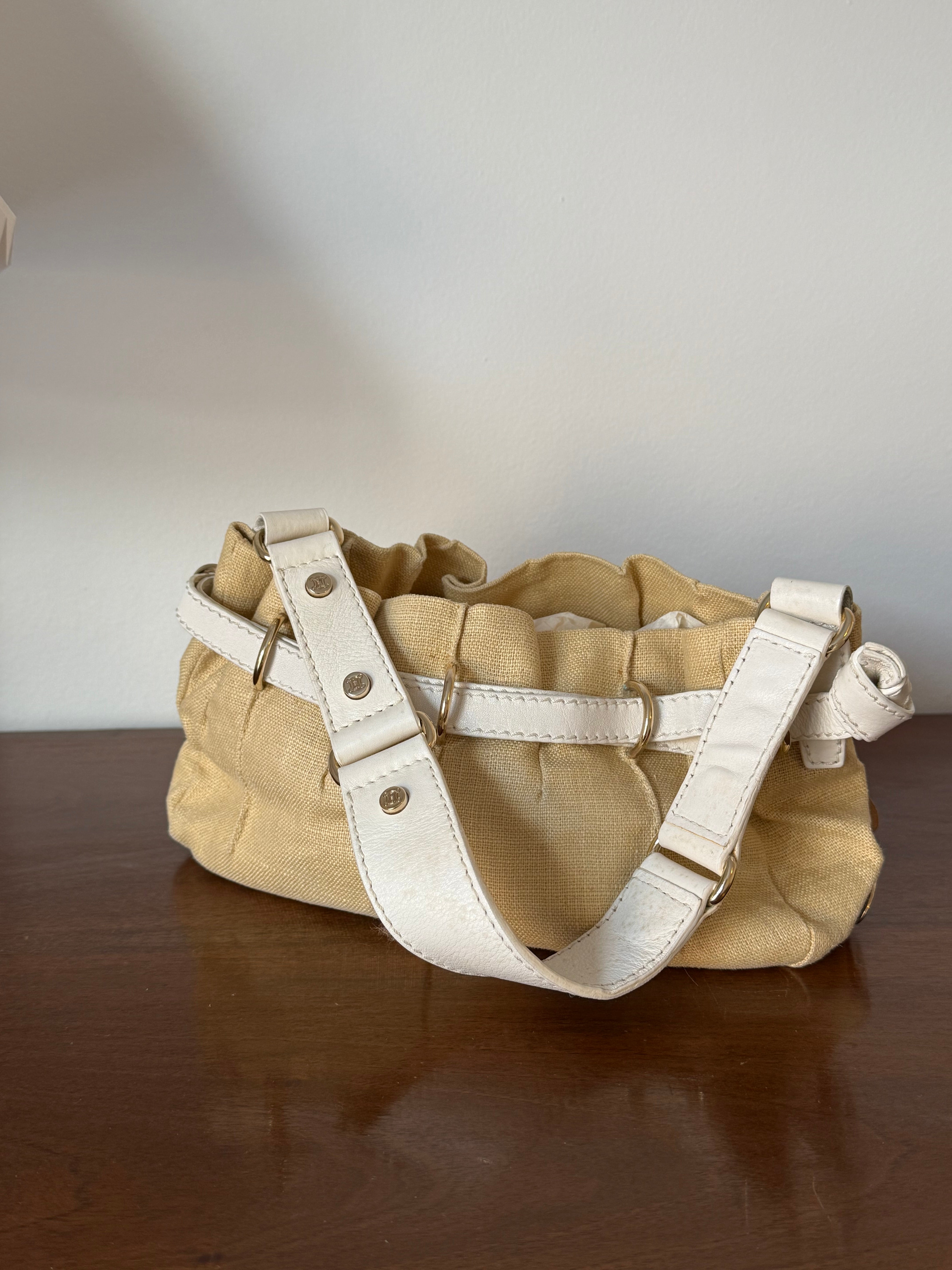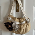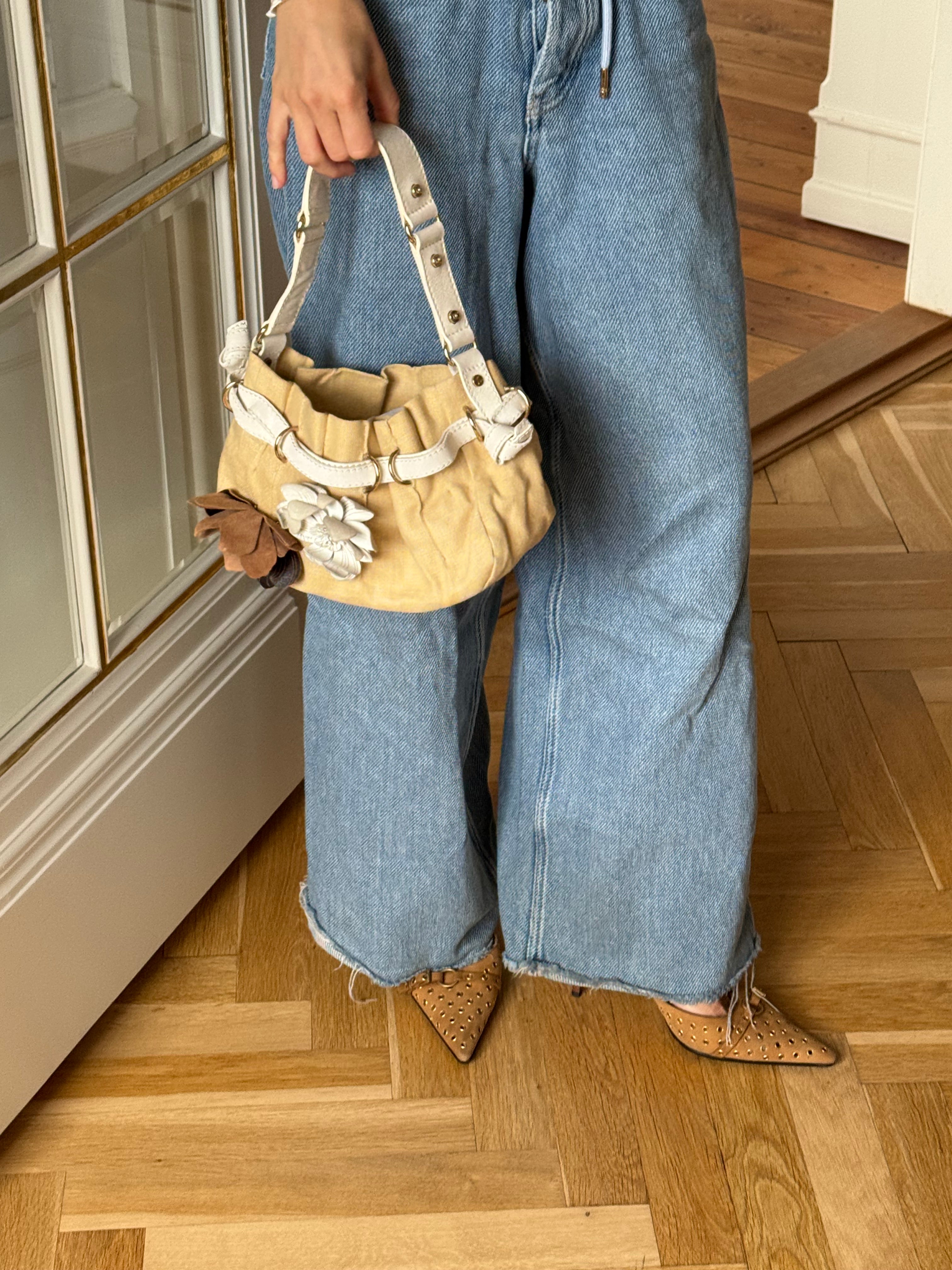 The most beautiful and rare vintage Celine mini bag in canvas and white leather. The bag features Triomphe studs and gold-tone hardware. The detachable leather flowers can be worn separately or repositioned on the bag. It is in very good vintage condition and includes one zippered pocket inside.
