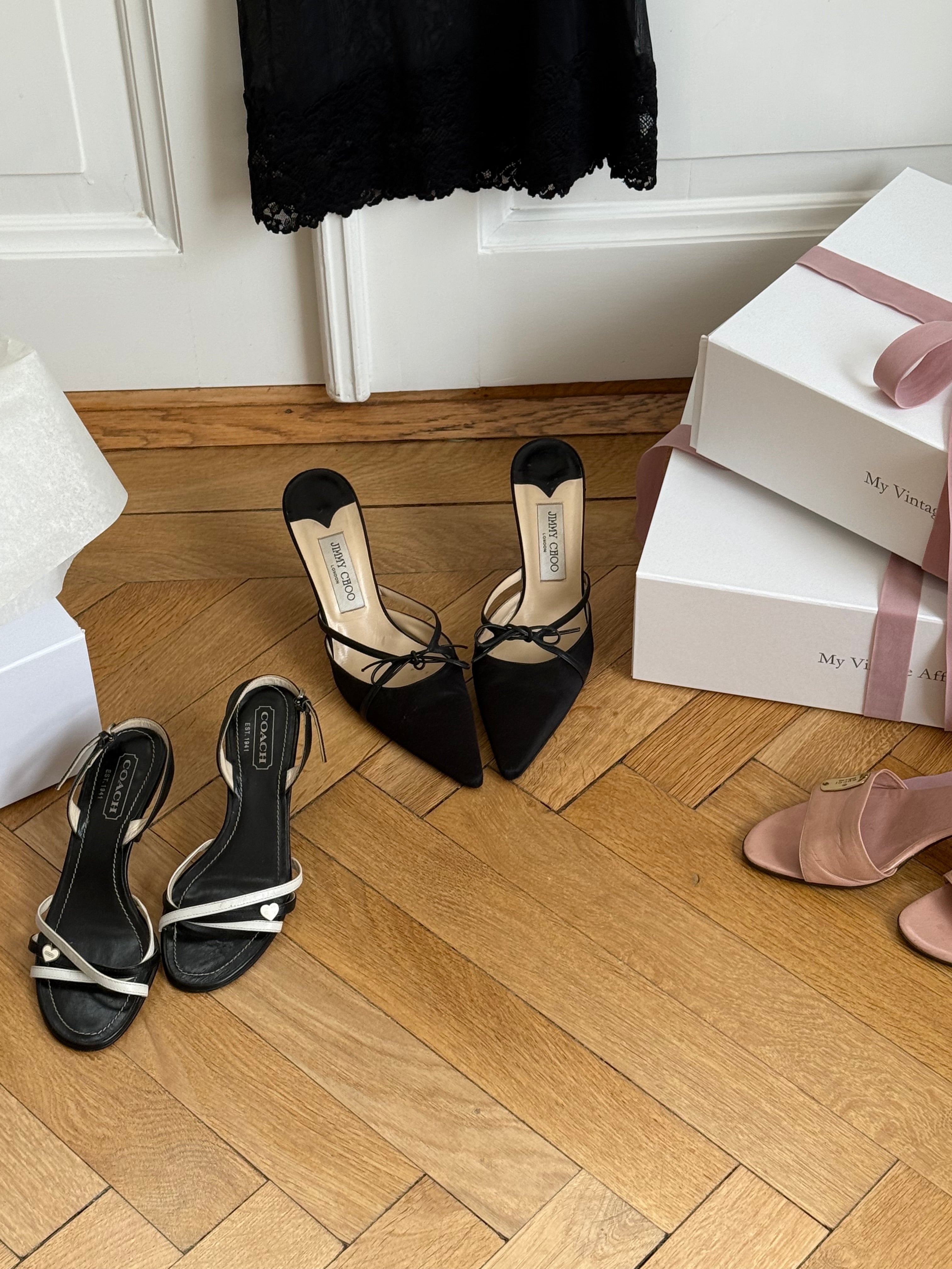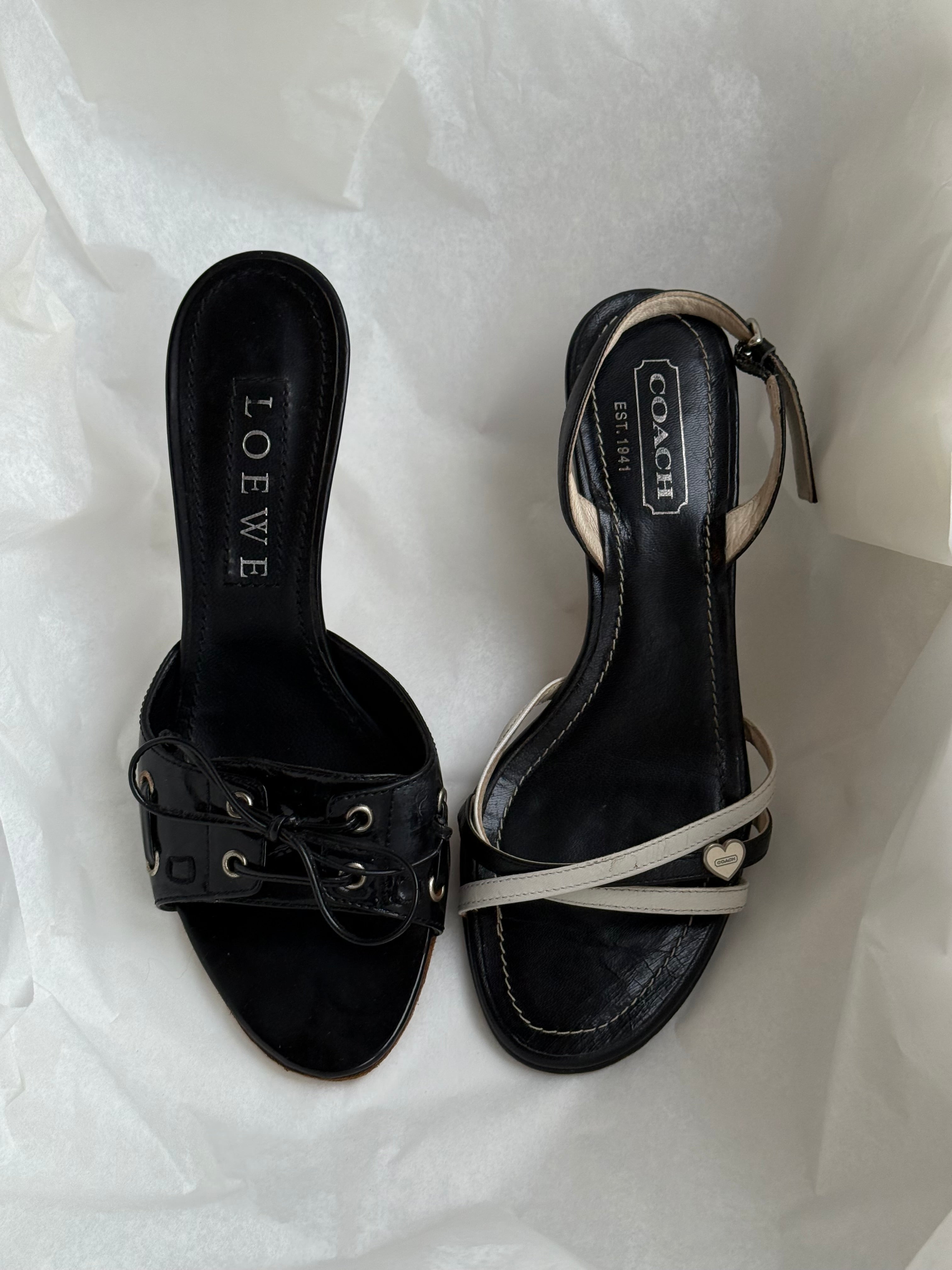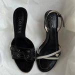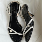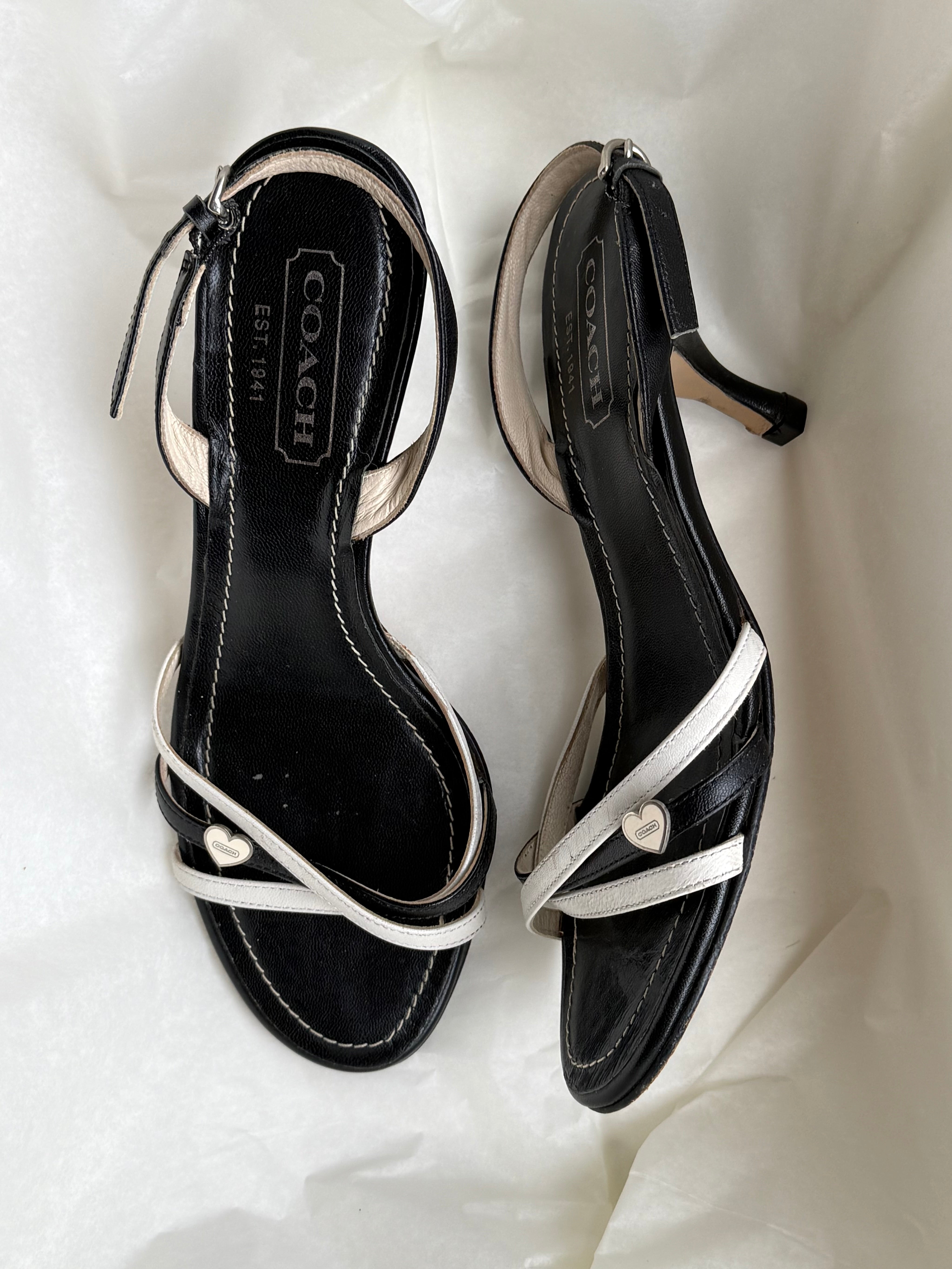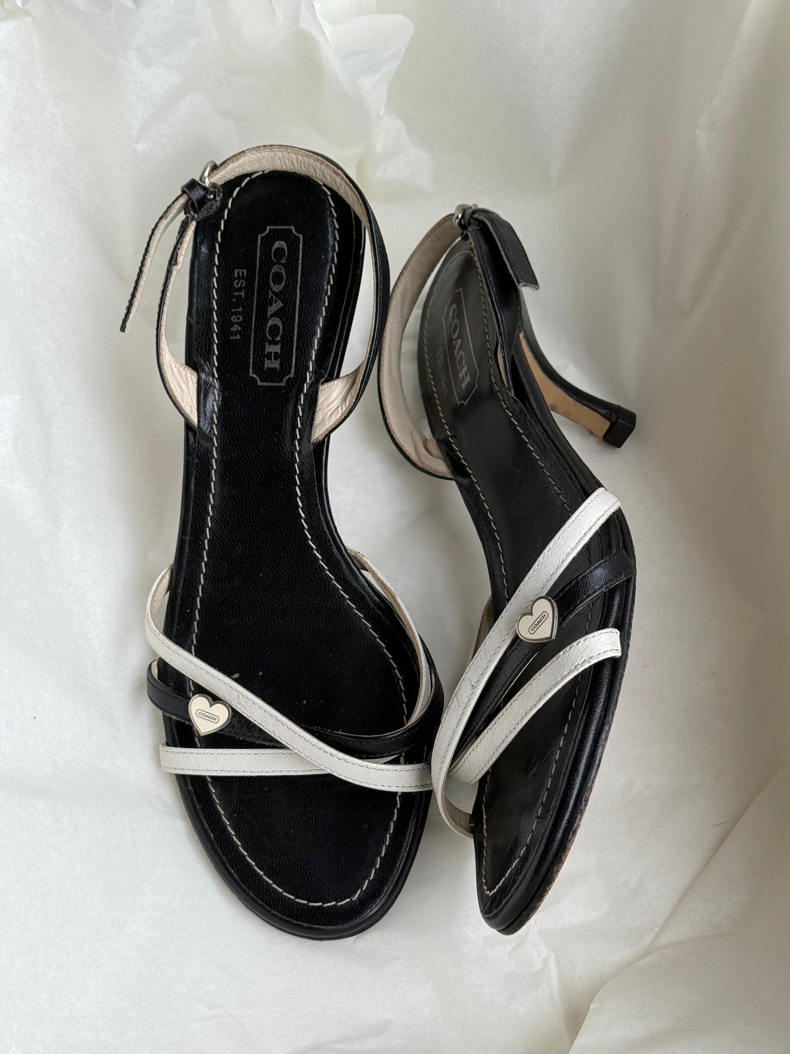 Vintage Coach strappy sandals in black and white leather with cute heart charm detail.