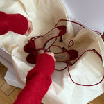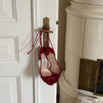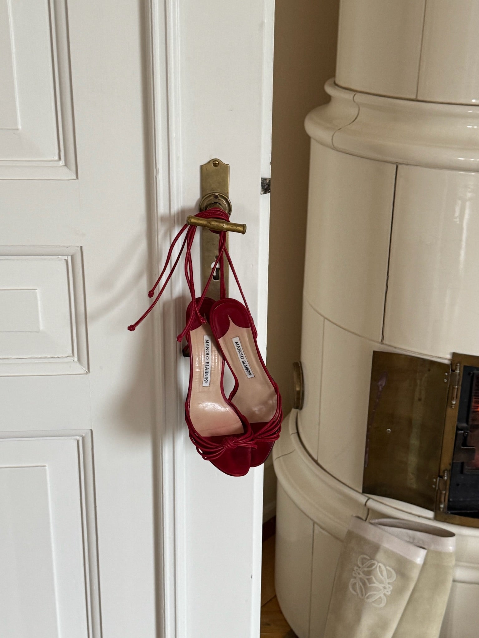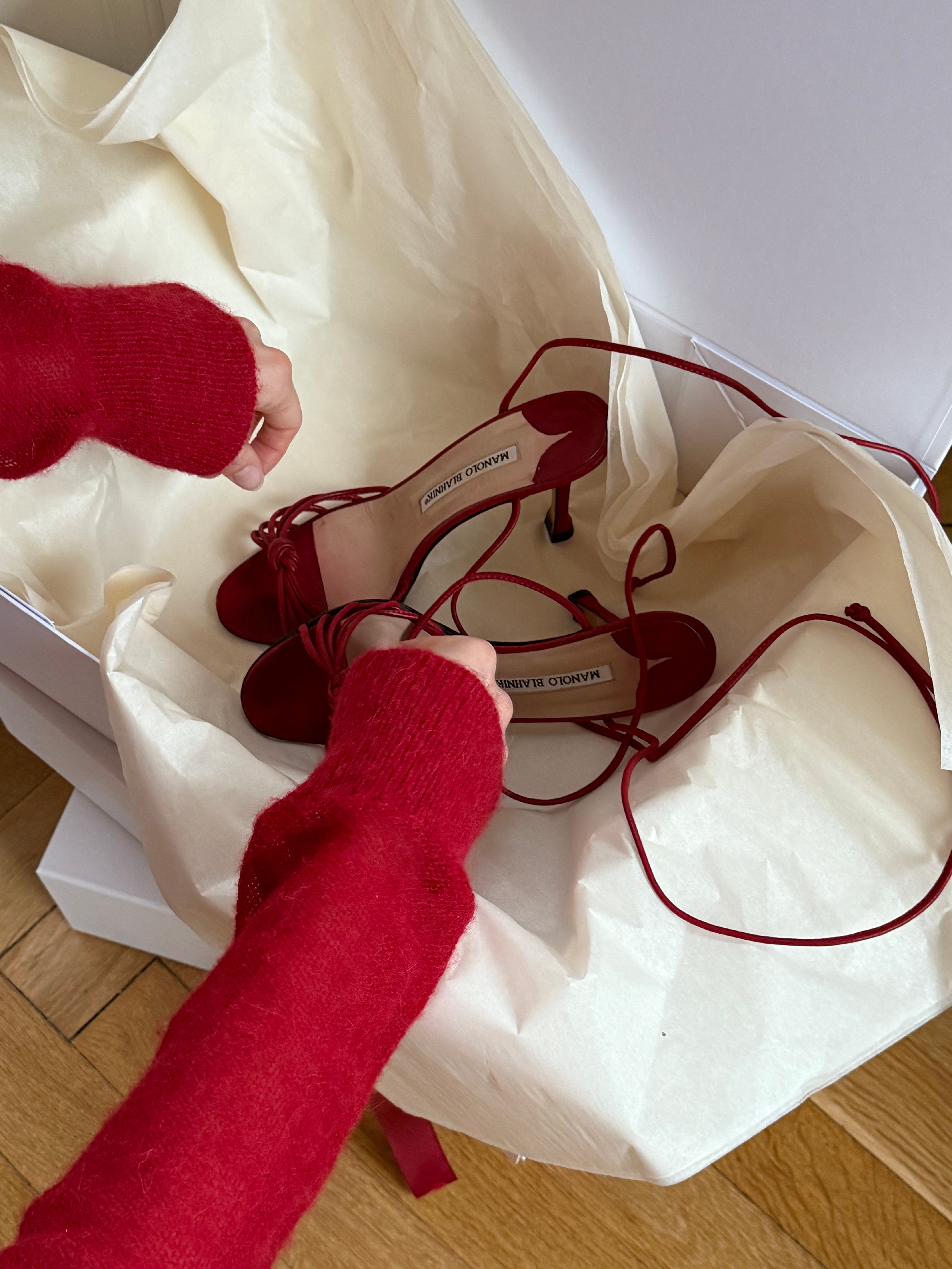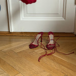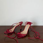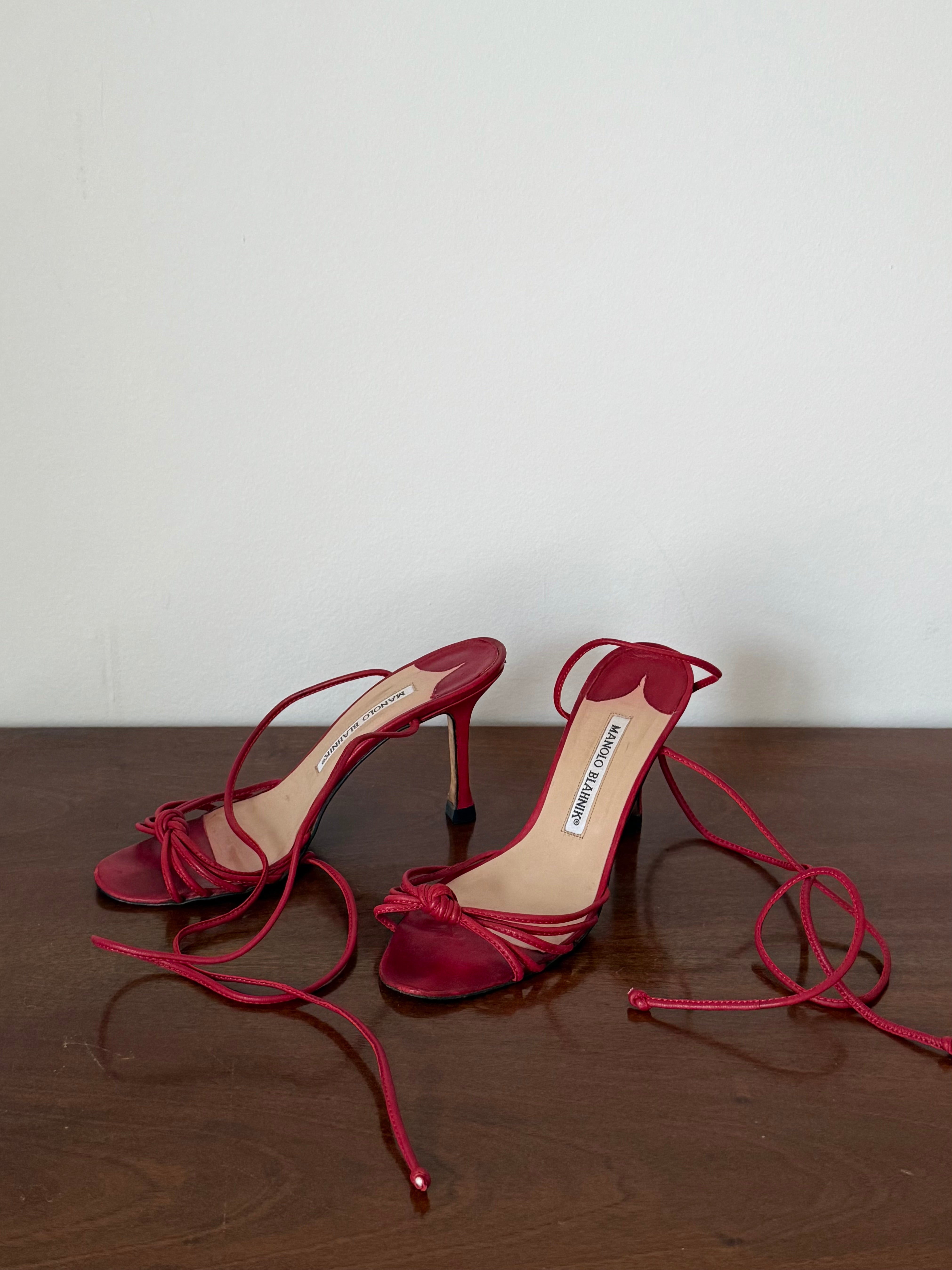 Vintage Manolo Blahnik red lace-up sandals with an open toe, knotted front detail, slim heel and long straps that wrap around the ankle.