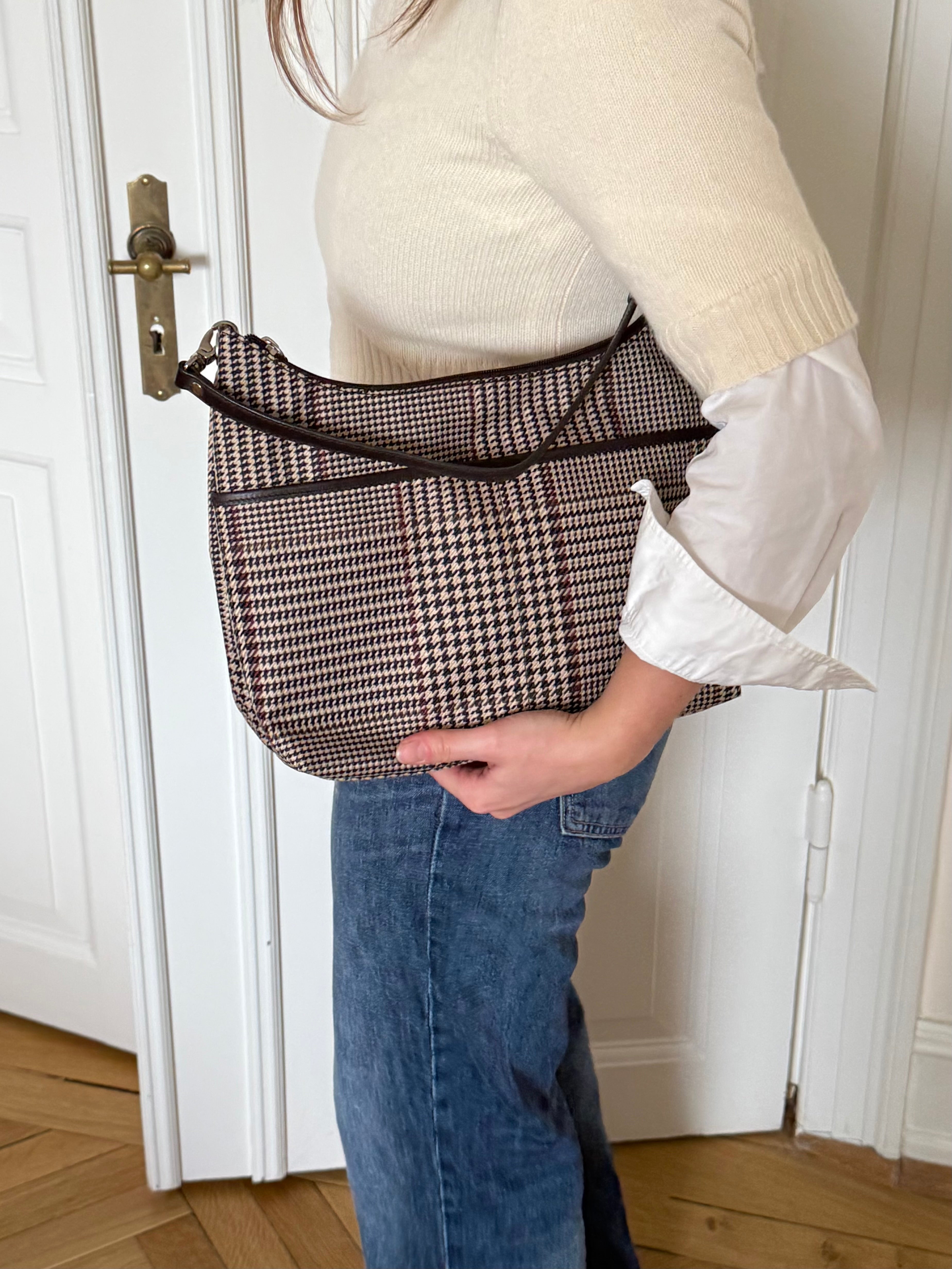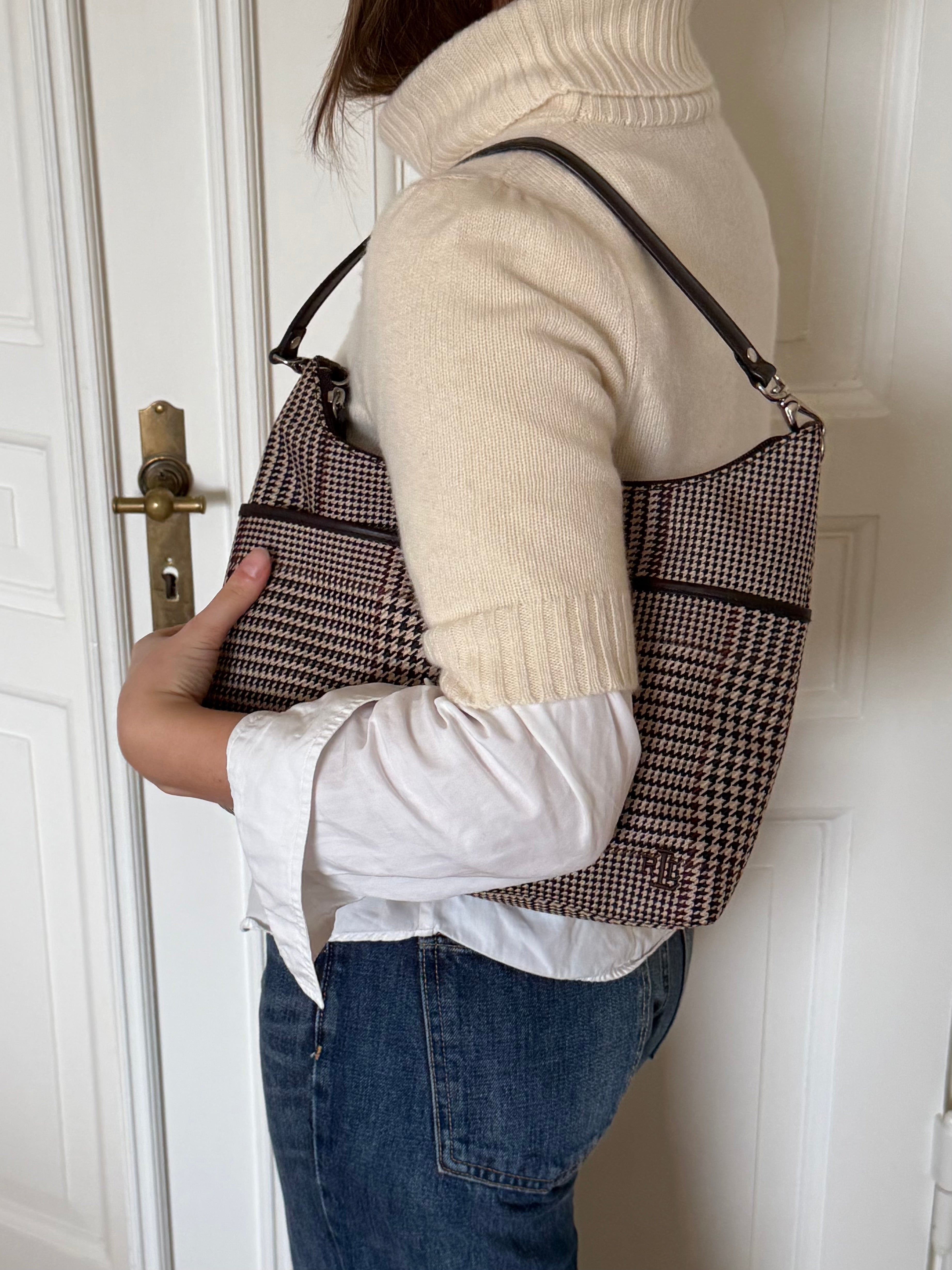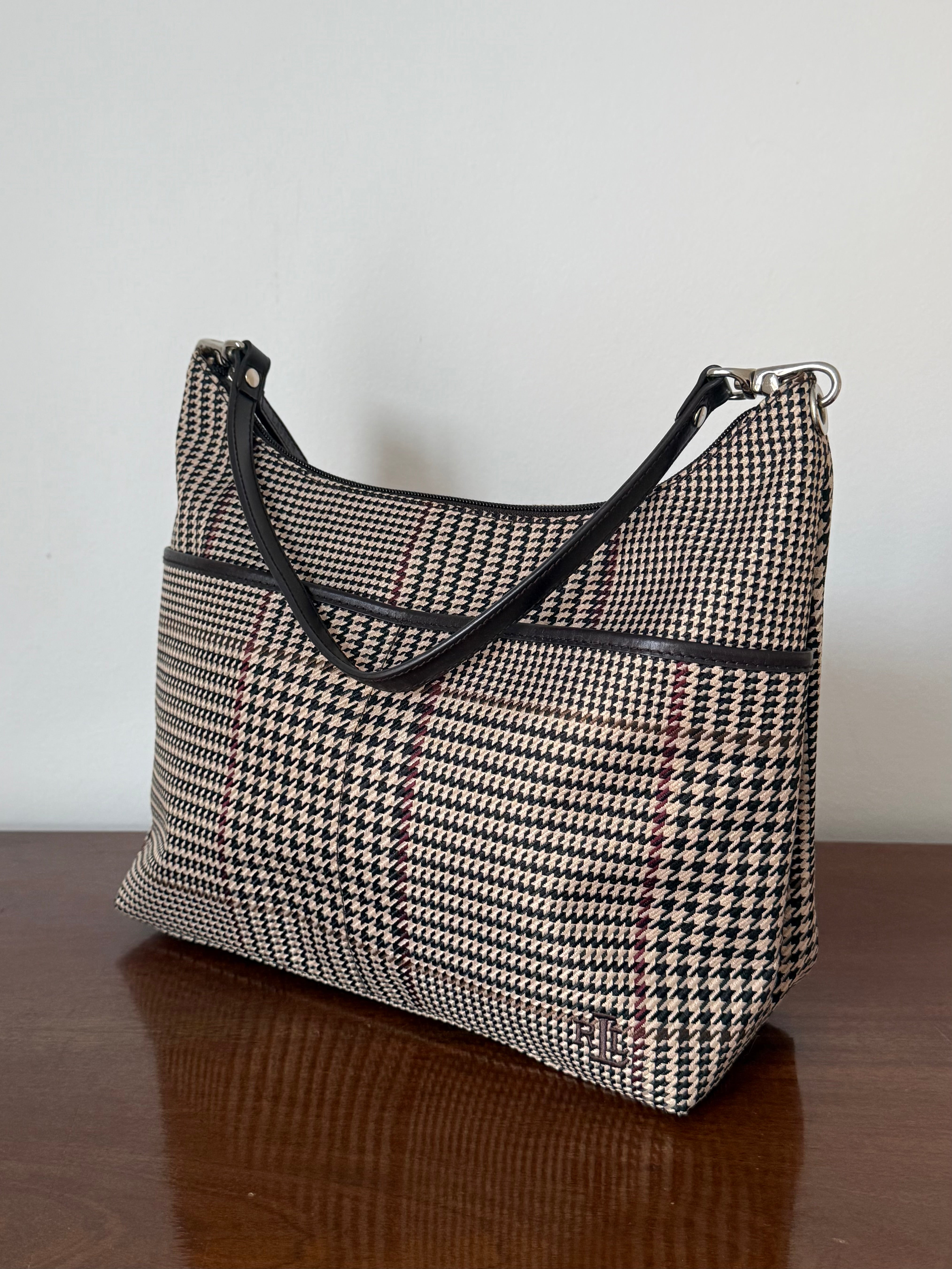 Vintage Ralph Lauren check shoulder bag with dark brown leather trim and handles.